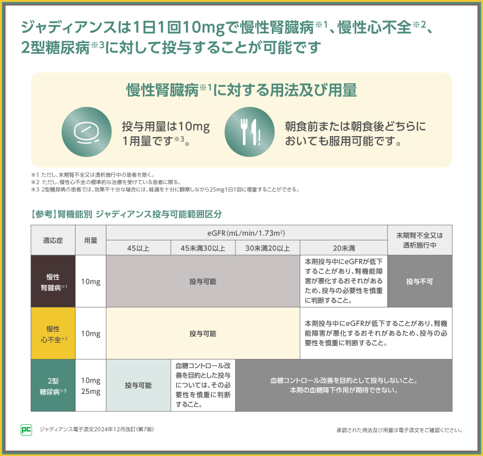 ジャディアンスは、慢性腎臓病※1、慢性心不全※2に対しては、1日1回10mg、2型糖尿病に対しては1日1回10mgまたは25mgの用量が設定されており、2型糖尿病に対しては治療強化が可能です。