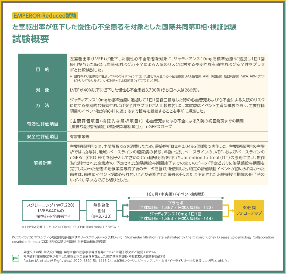 左室駆出率40%以下の慢性心不全患者(HFrEF)を対象としたEMPEROR-Reduced試験では、ジャディアンス10mgを1日1回経口投与した時の有効性および安全性のプラセボ群と比較検討を、全体集団解析に加え、CKD合併とCKD非合併に分けた事前規定されたサブグループ解析で行いました。