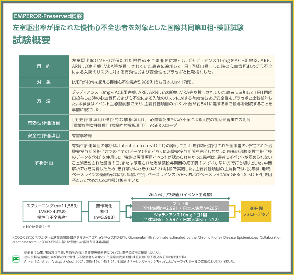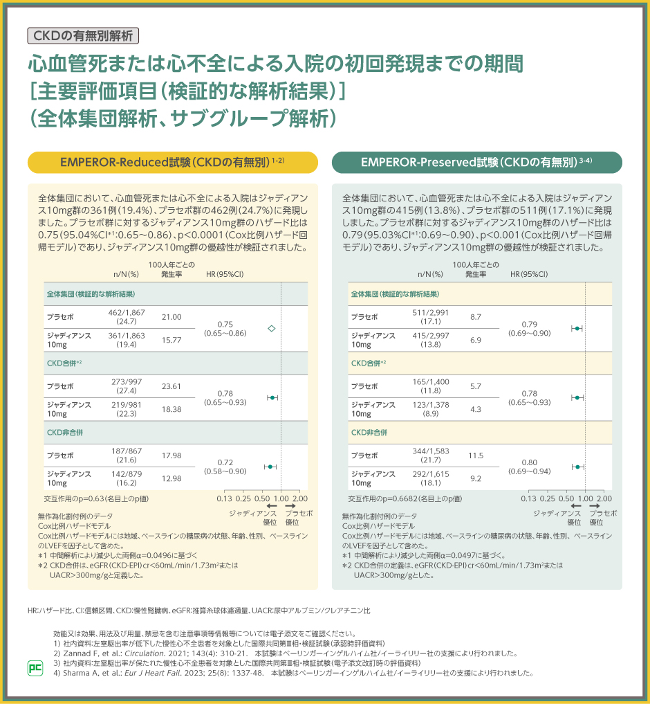 左室駆出率40%超の慢性心不全患者(HFpEF)を対象としたEMPEROR-Preserved試験でも、ジャディアンス10mgを1日1回経口投与した時の有効性および安全性のプラセボ群と比較検討を、全体集団解析に加え、CKD合併とCKD非合併に分けた事前規定されたサブグループ解析で行いました。