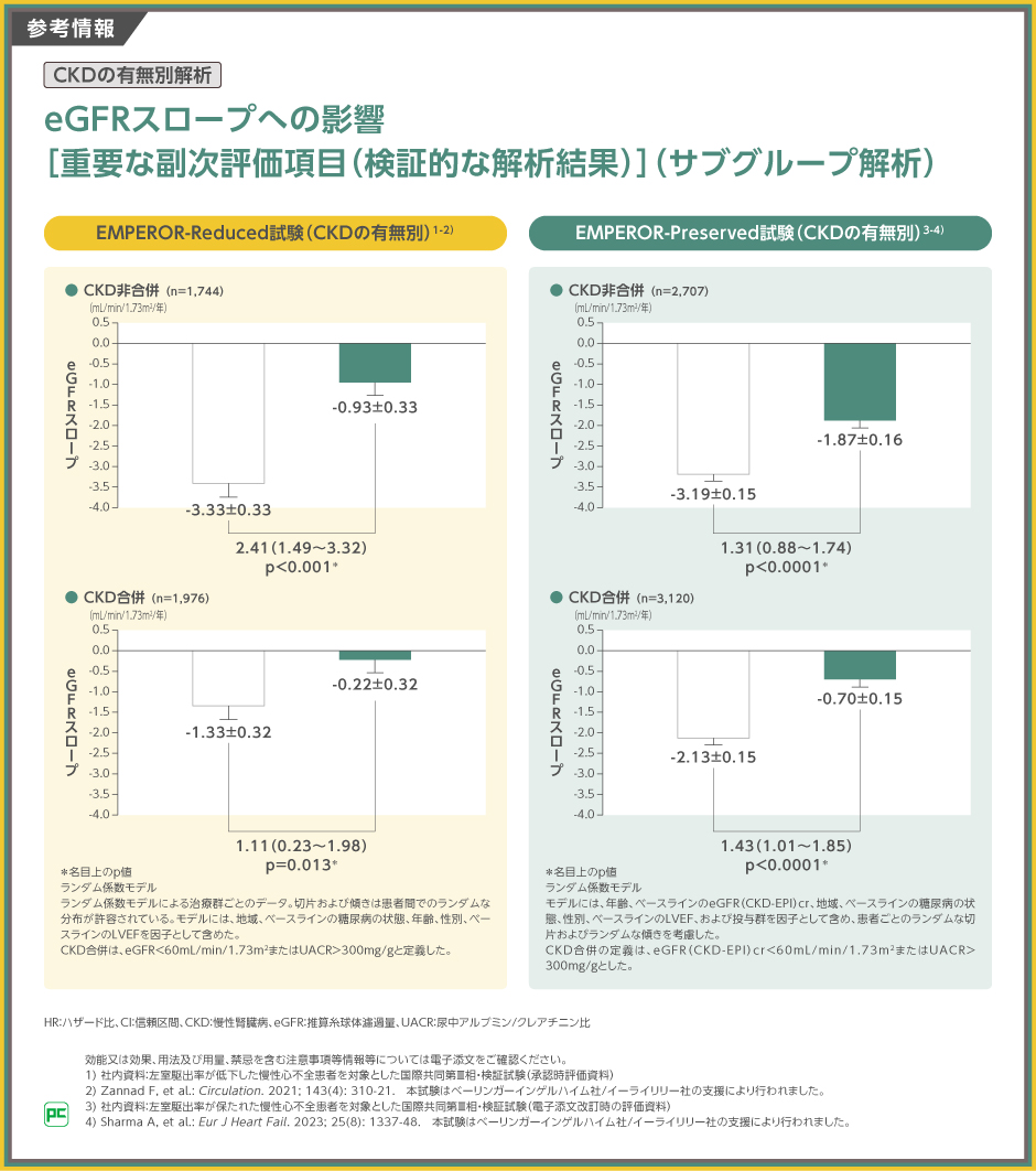 EMPEROR-Preserved試験では、CKD合併のジャディアンス10mg群で-0.70±0.15、プラセボ群で-2.13±0.15、CKD非合併のジャディアンス10mg群で-1.87±0.16、プラセボ群で-3.19±0.15でした。ジャディアンス10mg群とプラセボ群の差はCKD合併で1.43、CKD非合併で1.31でした。