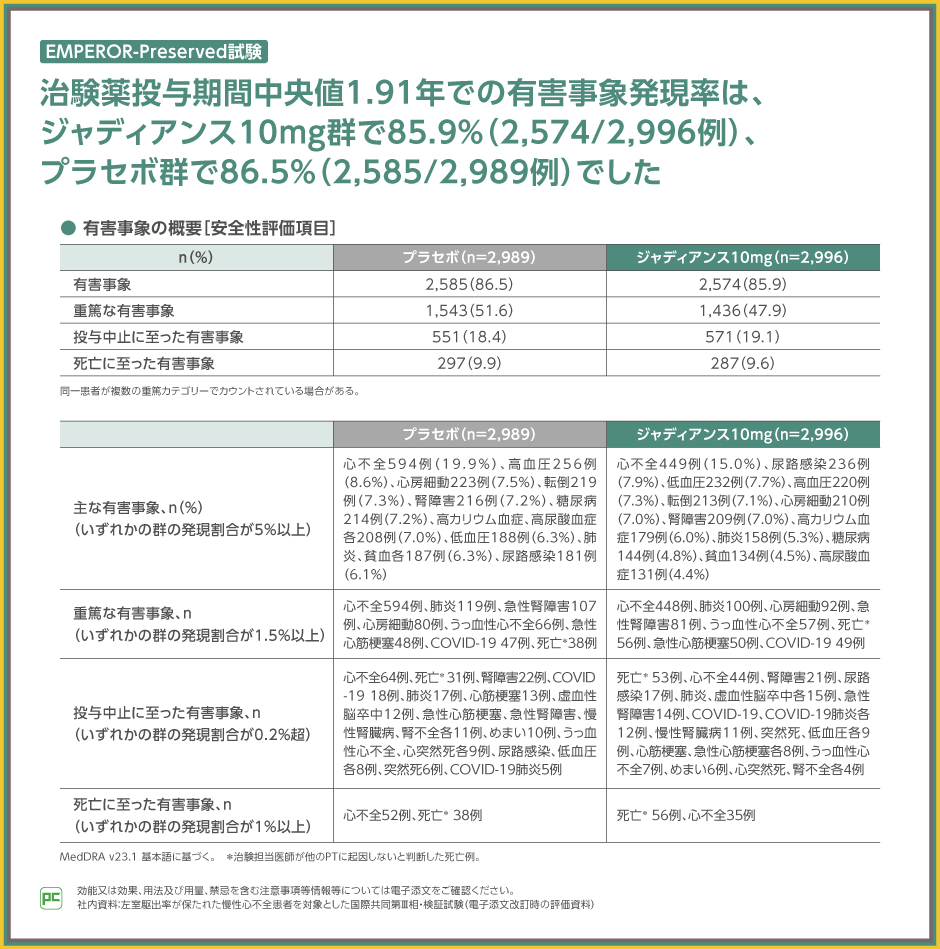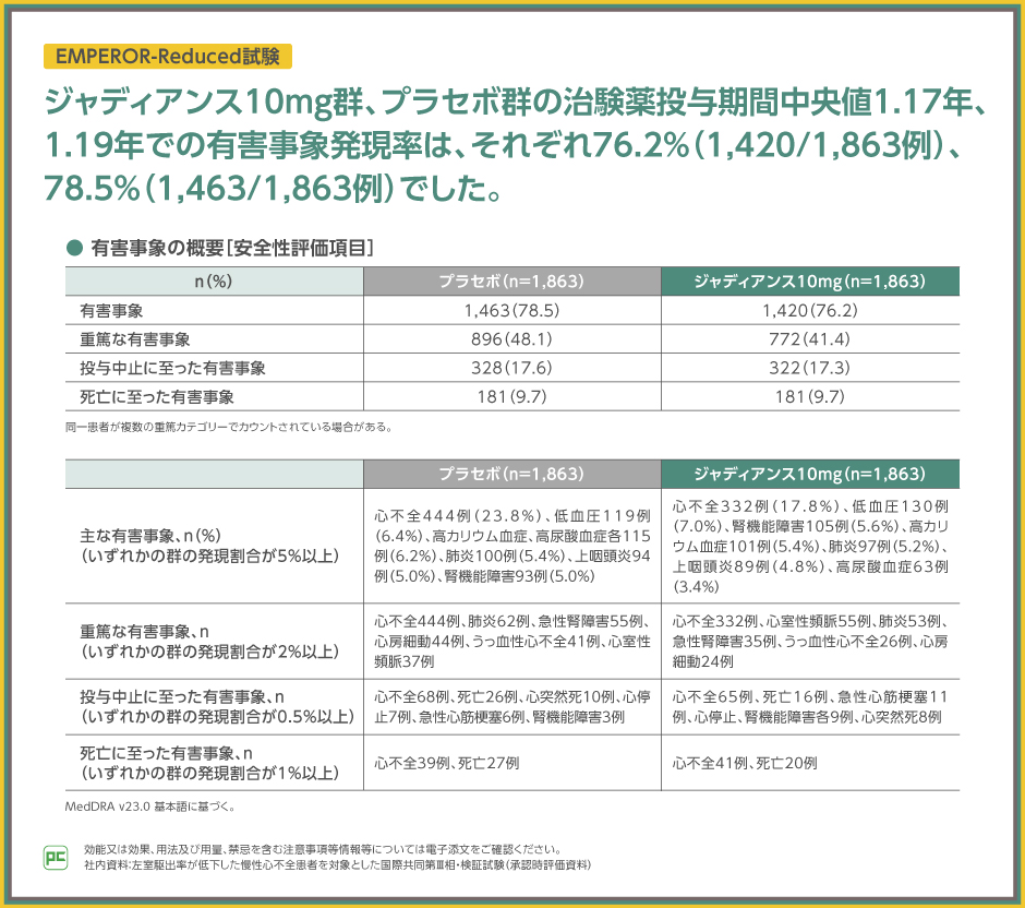 主な有害事象は、ジャディアンス10mg群で心不全17.8%、低血圧7.0%、腎機能障害5.6%等でした。