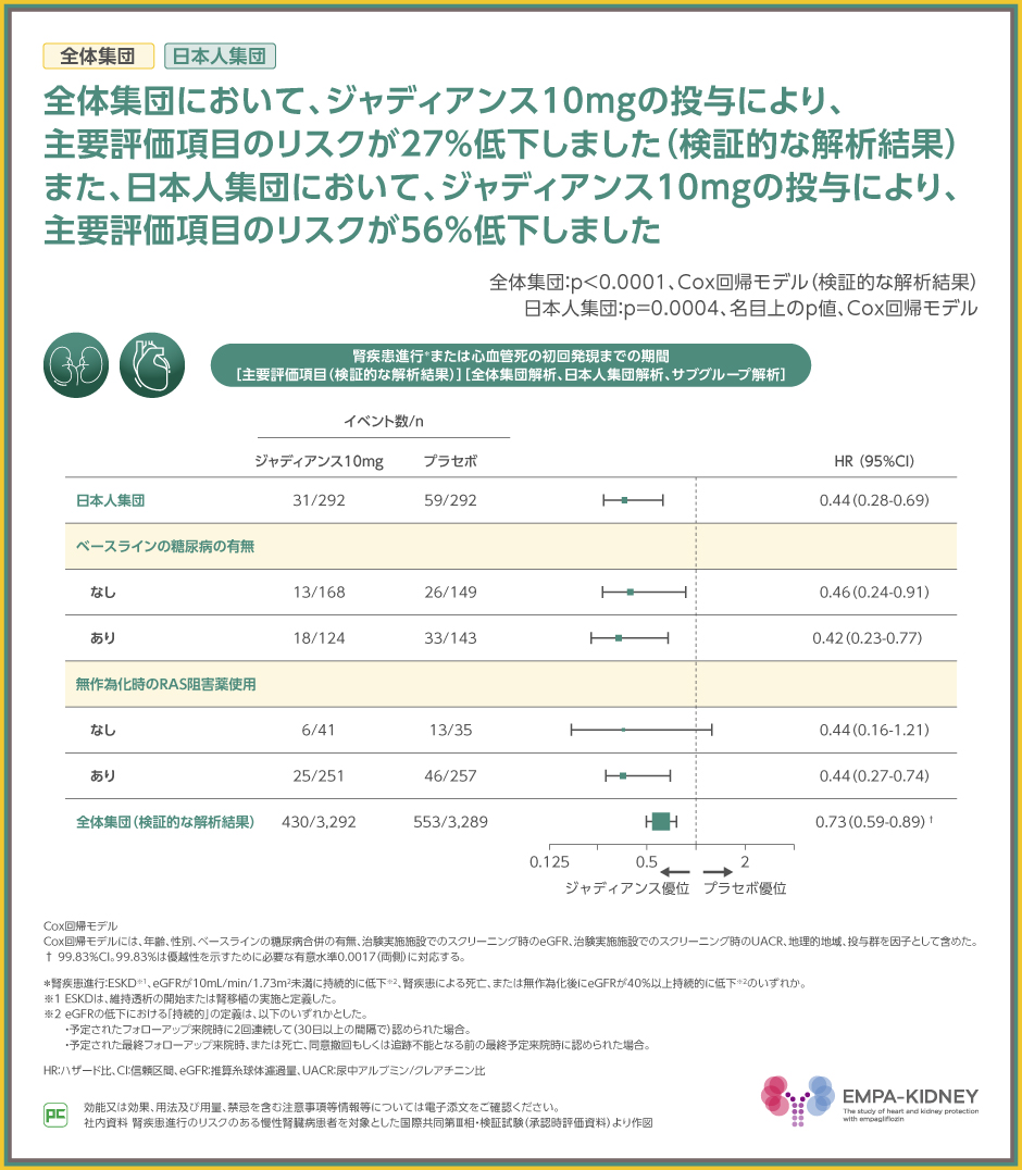 腎疾患進行または心血管死のプラセボ群に対するジャディアンス10mg群のハザード比は0.73(99.83%CI:0.59~0.89)、p<0.0001(Cox回帰モデル)であり、ジャディアンス10mg群の優越性が検証されました。