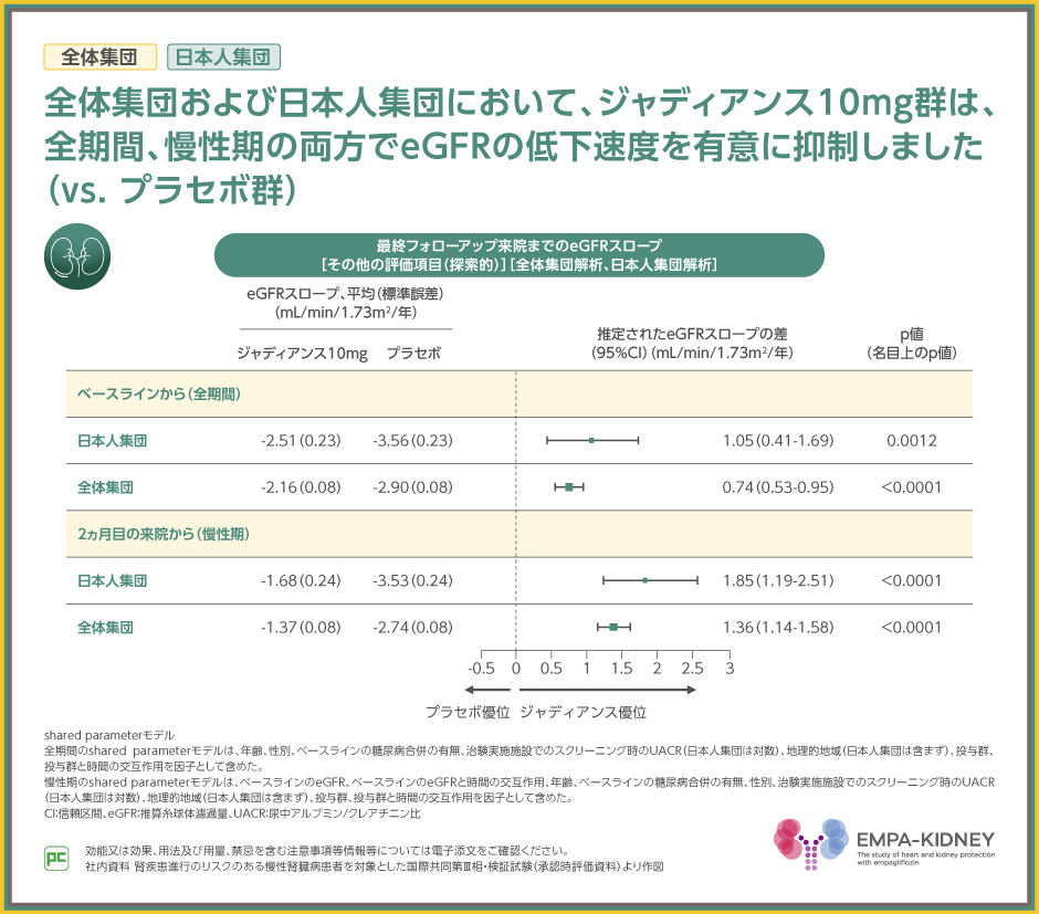 その結果、全体集団および日本人集団において、全期間、慢性期の両方で、ジャディアンス10mg群は、eGFRの低下速度を有意に抑制しました(vs. プラセボ群、全体集団の全期間・慢性期および日本人集団の慢性期:p<0.0001、日本人集団の全期間:p=0.0012、いずれも名目上のp値、shared parameterモデル)。