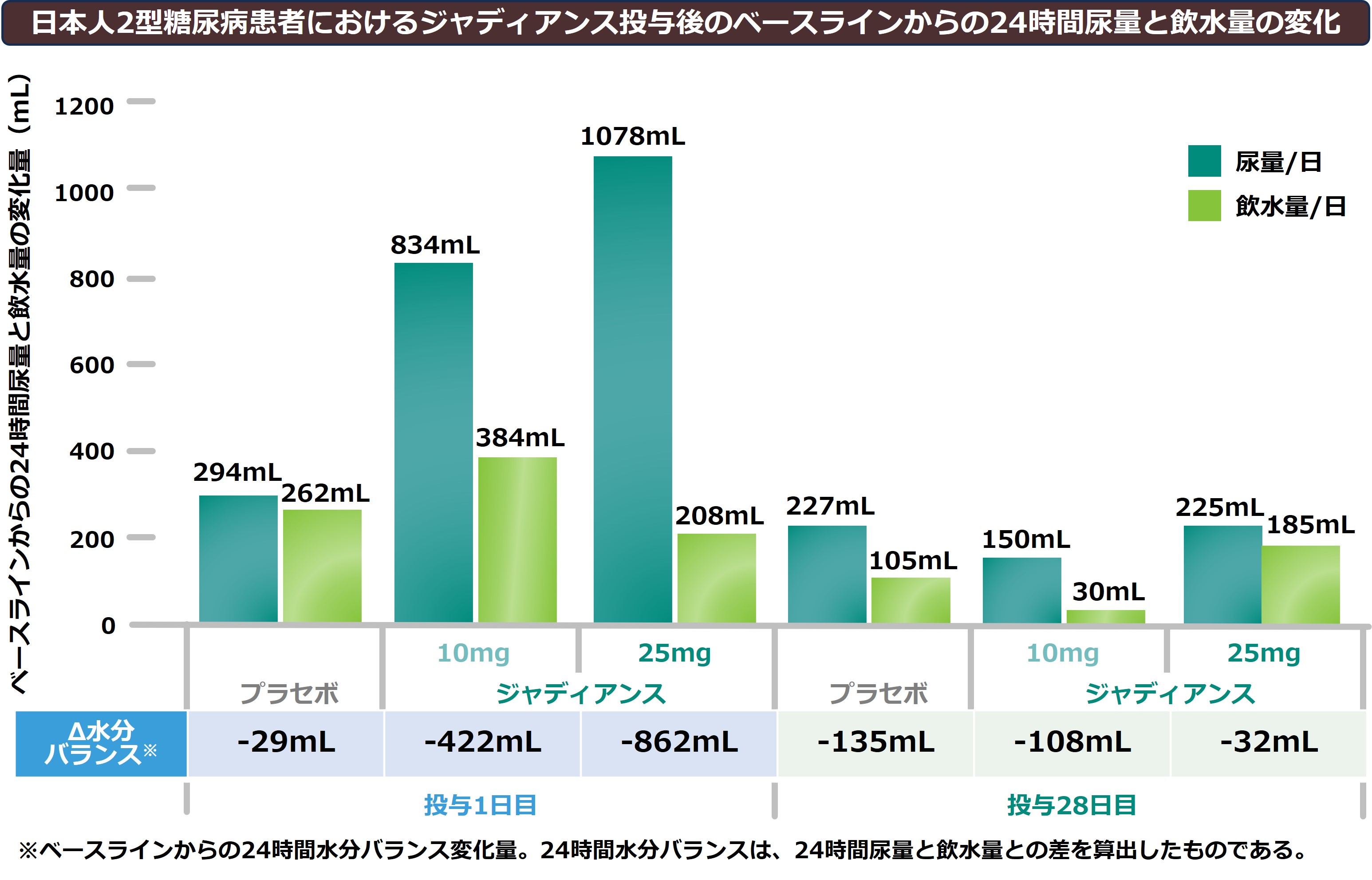 ジャディアンスで日本人を対象に検討した試験において、投与28日目のベースラインからの尿量の変化はプラセボとジャディアンス群で同程度であり、また海外データでは5日目に尿量がベースライン時と同程度であることが示されています3)。