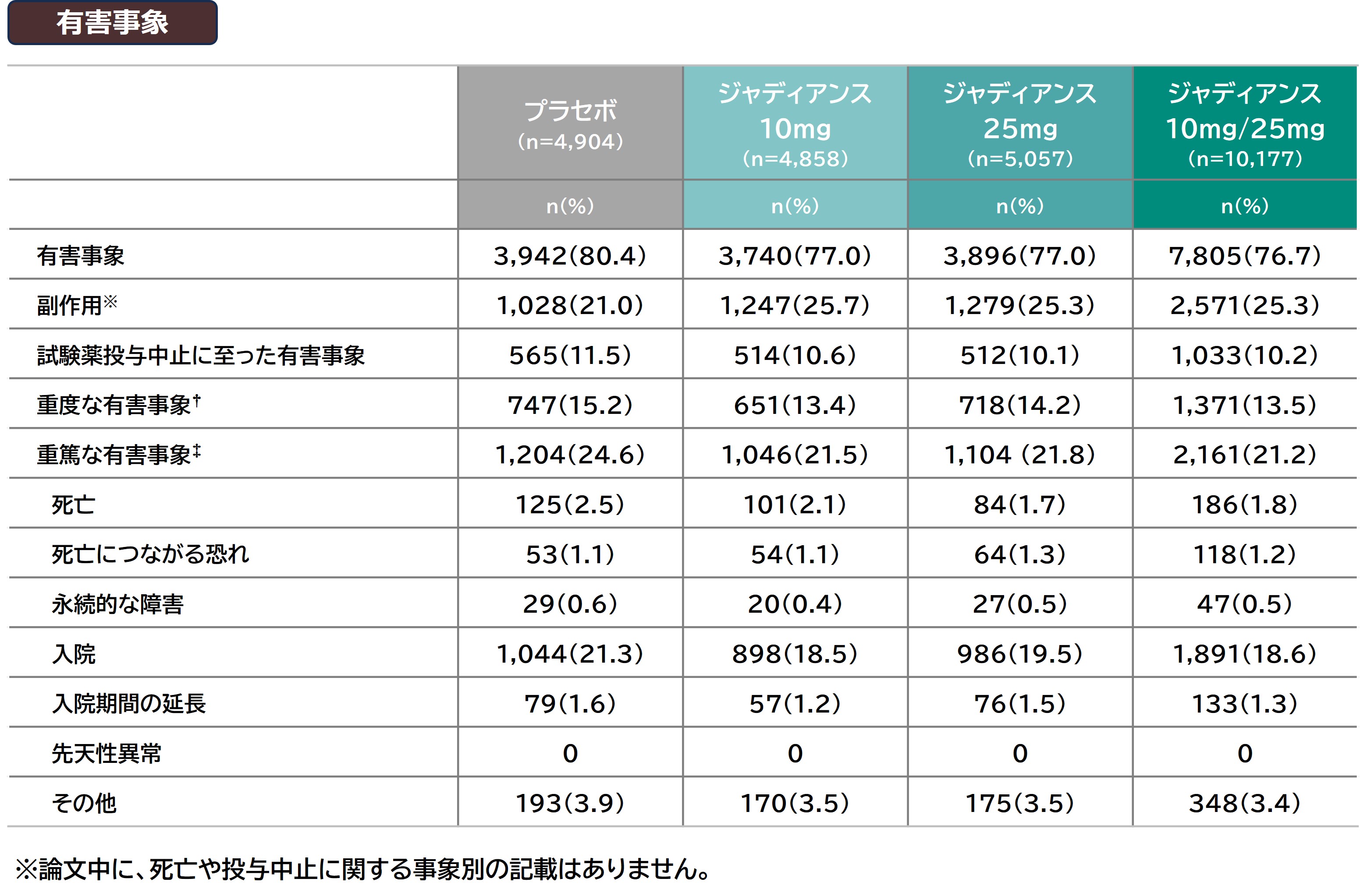 - 本試験において、脱水関連の有害事象はジャディアンス群およびプラセボ群において認められなかった。