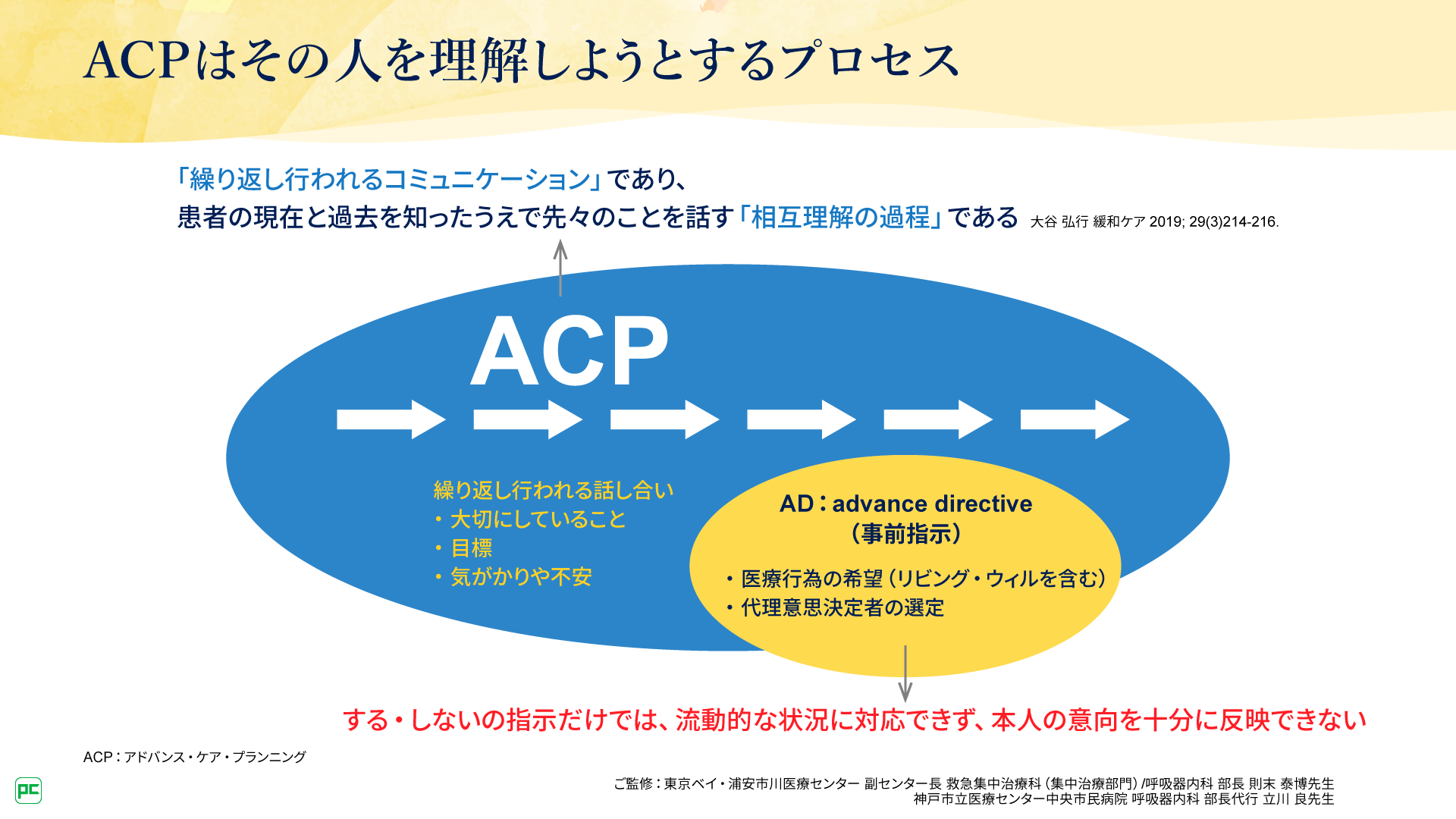 ACPの前身として、アドバンス・ディレクティブ(AD)やリビング・ウィル(LW)が提唱されていました。ADやLWは、呼吸機能が低下しても人工呼吸器はやめてほしいといったような患者さんの治療に対する希望を事前に文面に残すもので、患者さんが望まない治療から自分の身を守るための手段として登場し、発達してきました。しかし、ADやLWは、①調子が悪くなったときに、患者さんがADやLWを持参していること、②ADやLWに基づいて、ご家族が医師をはじめとする医療スタッフときちんと話し合ってくれること、③ご家族と医療スタッフの両方が患者さんの希望を尊重するという決断をすること、という3つの条件がそろわないと効果を発揮しませんでした。