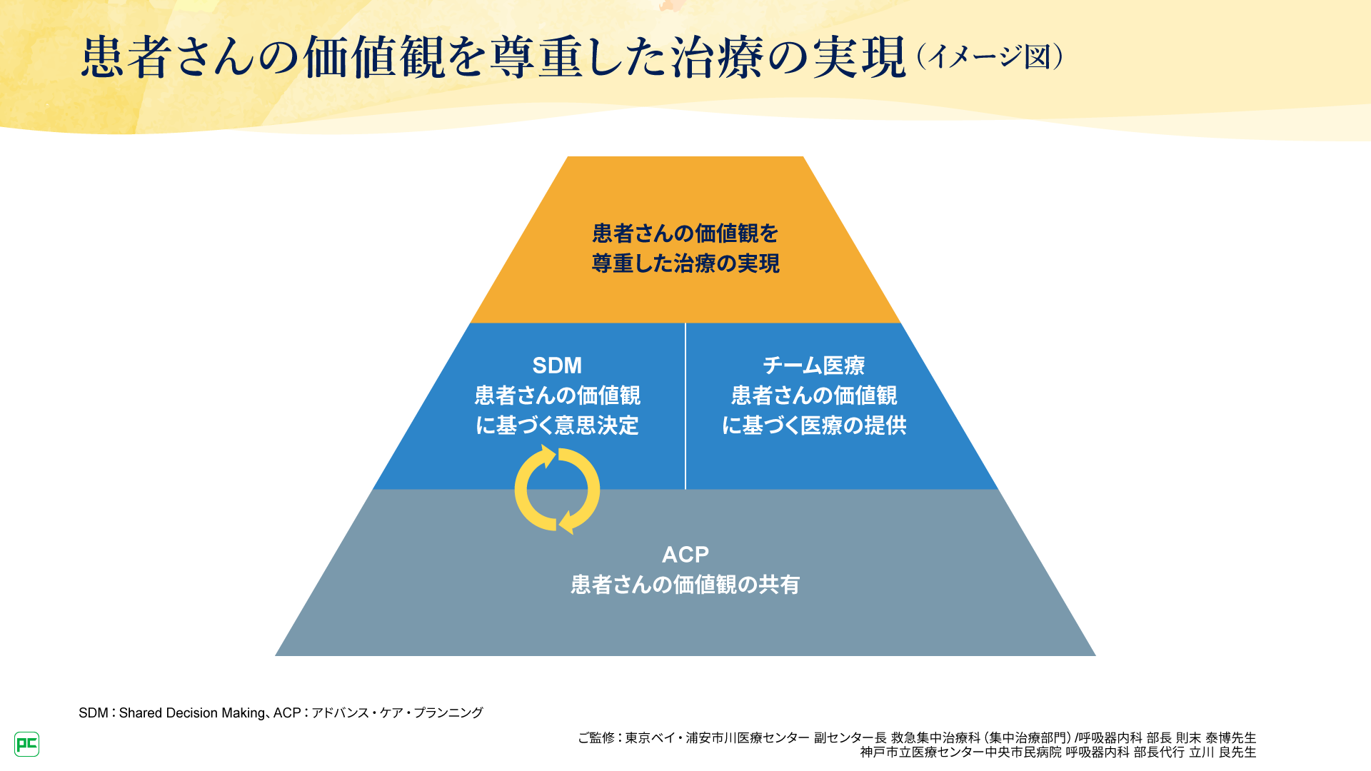 ACPは、患者さんの価値観が尊重された治療を行うことを目的に実施するものです。すなわち、治療の意思決定に役立つものでなければなりません。しかし、この目的は患者さんの価値観を共有するACPのみを実施するだけでは達成できません。ACPで共有した患者さんの価値観に基づいて、医師をはじめとする医療スタッフが治療選択肢を提案し、患者さんと一緒に意思決定を行うことで実際の治療に反映するプロセス、すなわち、Shared Decision Making(SDM)が必要になります。