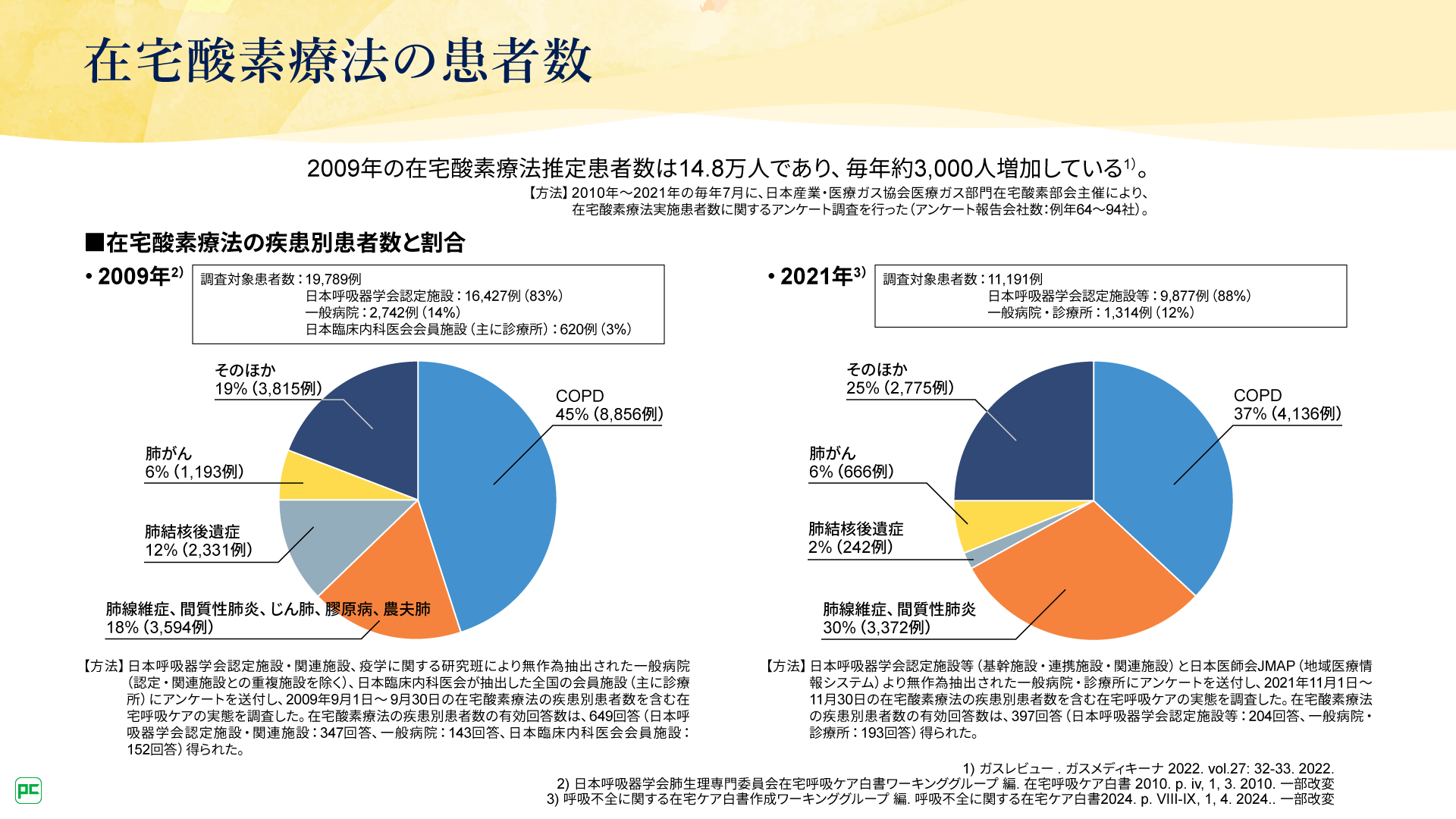 在宅呼吸ケアの実態を調べた調査では、在宅酸素療法を行っている患者さんのうちILD患者さんが占める割合は2009年時点で18%(3,594例/19,789例)※4でしたが8)、2021年時点では30%(3,372例/11,191例)※5だったことが報告されています9)。このデータと、在宅酸素療法推定患者数が2009年時点の14.8万人から毎年約3,000人増加していることをあわせて考えると10)、緩和ケアが必要なILD患者さんは増加していると考えられます(図4)。