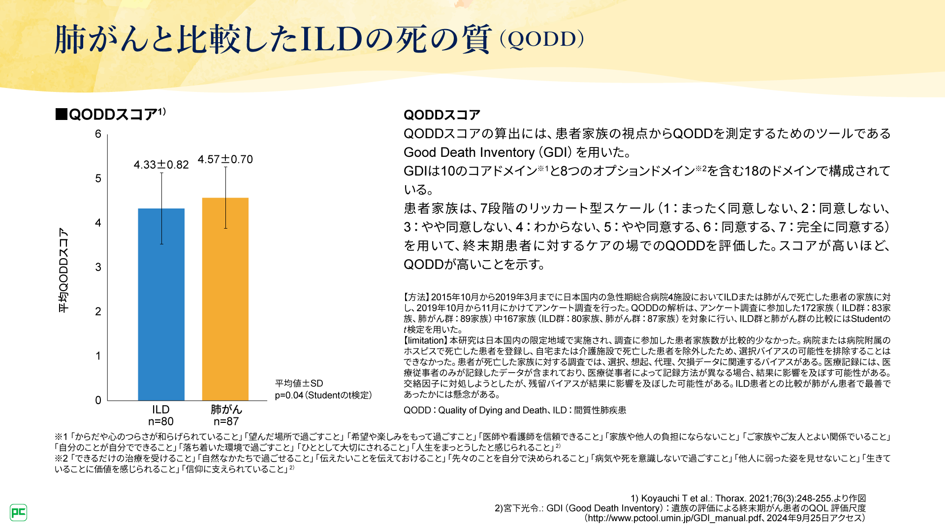 一方で、専門的な緩和ケアを受けたILD患者さんの割合は肺がん患者さんよりも少なく(図5)、死の質(Quality of Dying and Death:QODD)も低かったことが報告されています(図6)11)。