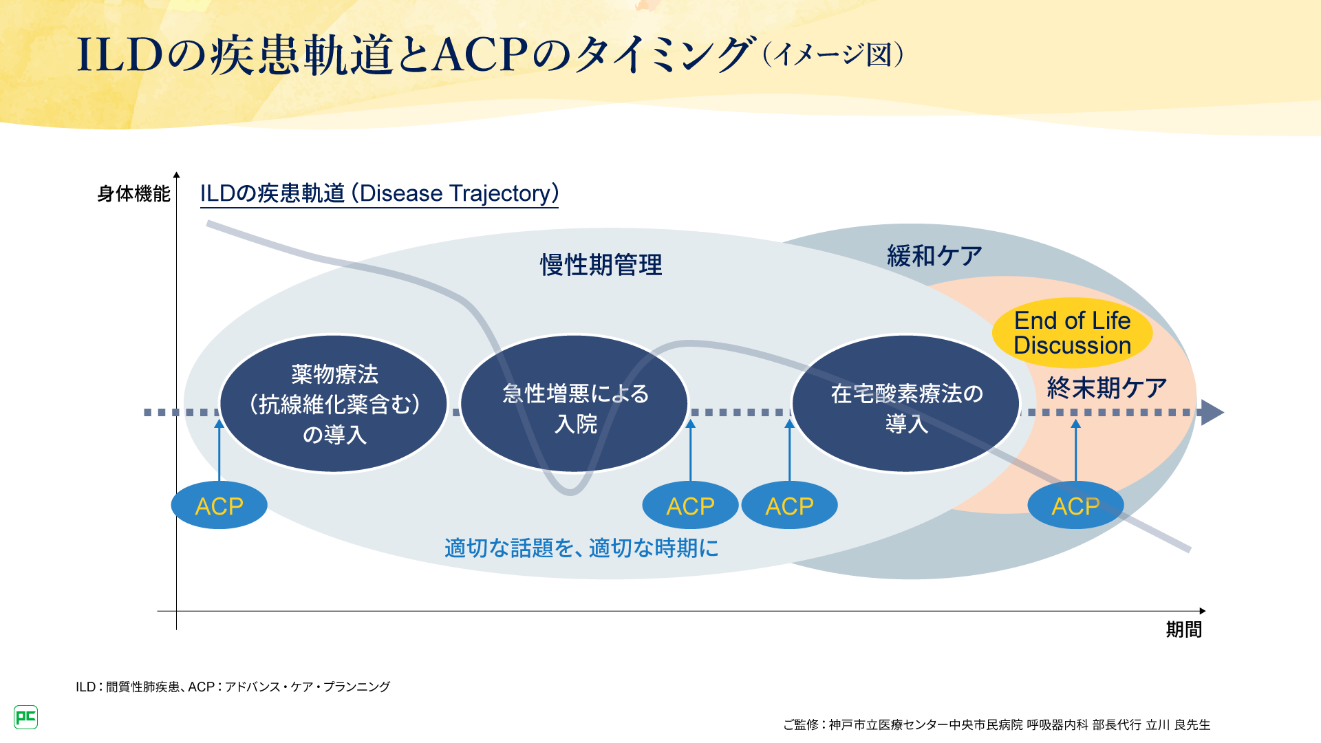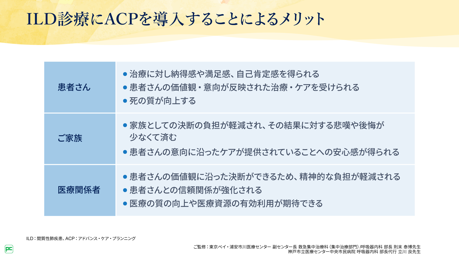 また、ACPは、ILD診療で求められるチーム医療の実施においても役立ちます。チーム医療の実施という観点からも、焦らず、諦めずにACP導入に取り組んでいただけますと幸いです。