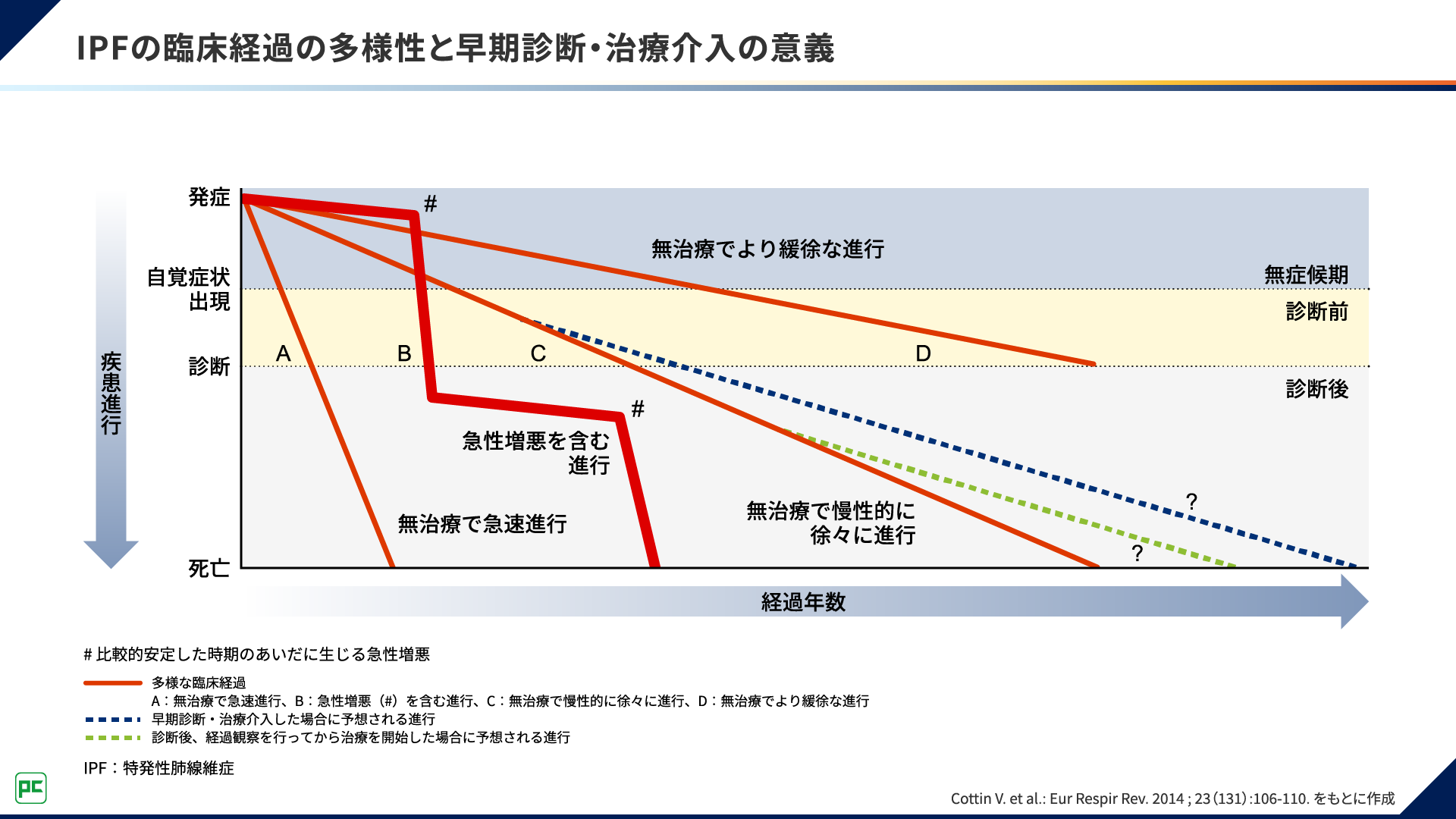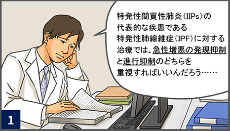 そもそも、IPFの臨床経過は図1のAのように無治療で急速に進行するものから、Dのように緩徐な進行を示すものまで多岐にわたります。