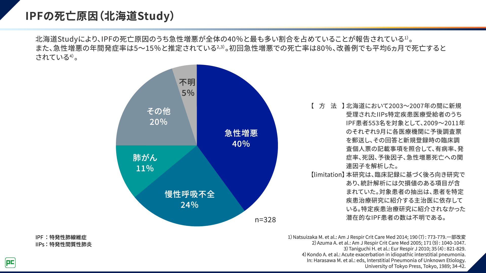 また、急性増悪はIPF患者さんの死亡原因にもなることが報告されています。北海道StudyにおけるIPF患者さんの死亡原因が図2に示されていますが、急性増悪が死亡原因だった患者さんは、全体の40%と最も多い割合を占めていました1)。