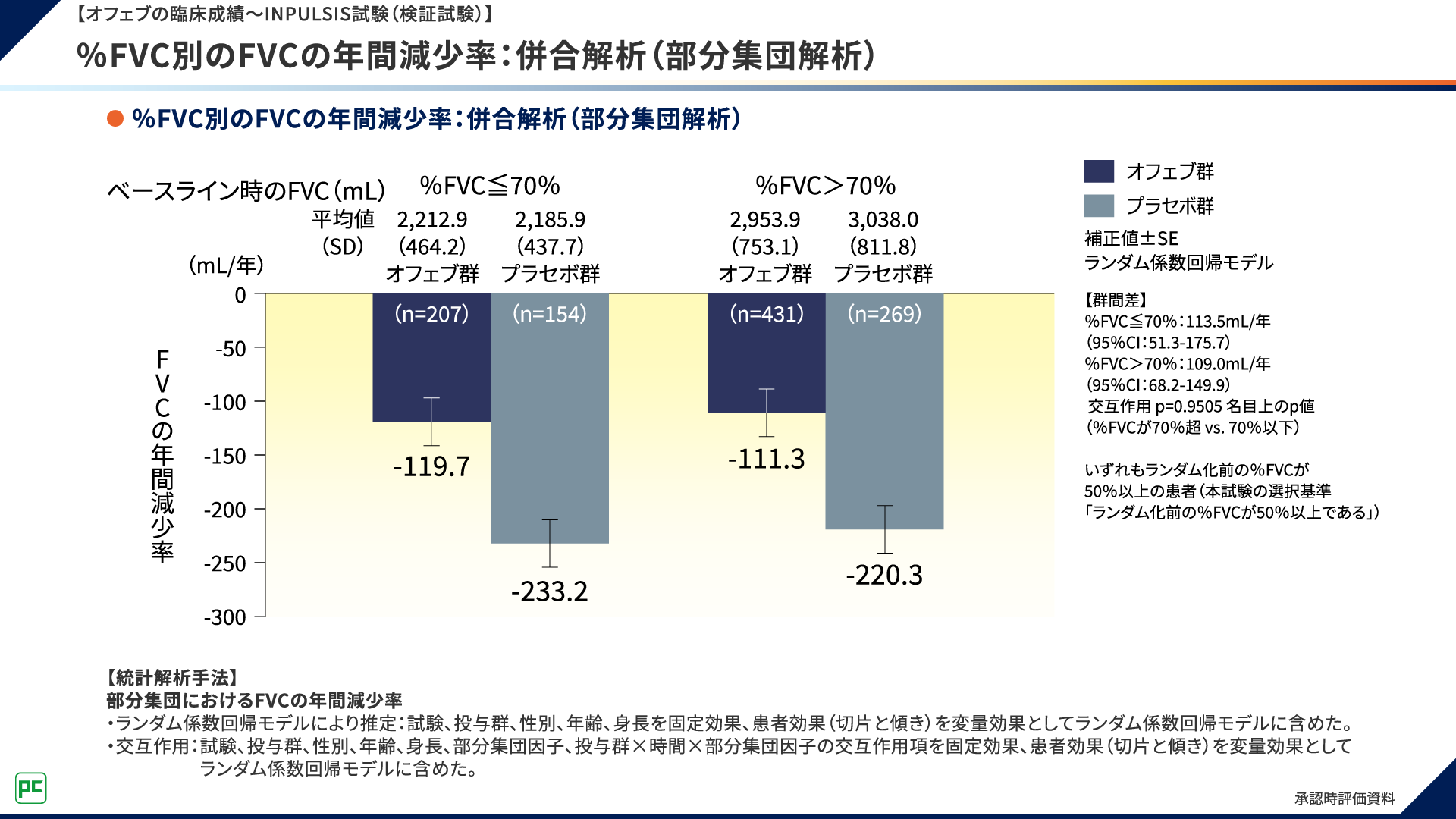 FVCの年間減少率は、%FVC70%以下の集団でオフェブ群-119.7mL/年、プラセボ群-233.2mL/年であり、%FVC 70%超の集団でオフェブ群-111.3mL/年、プラセボ群-220.3mL/年でした(図7)。
