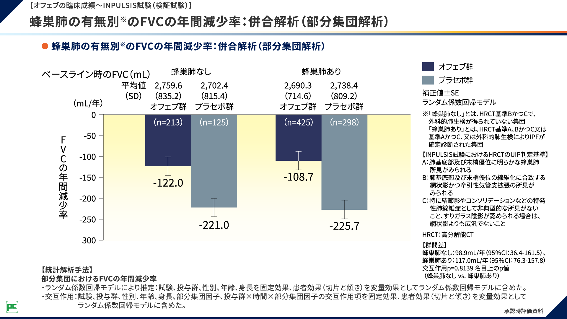 FVCの年間減少率は、蜂巣肺なしの集団でオフェブ群-122.0mL/年、プラセボ群-221.0mL/年であり、蜂巣肺ありの集団で、オフェブ群-108.7mL/年、プラセボ群-225.7mL/年でした(図8)。