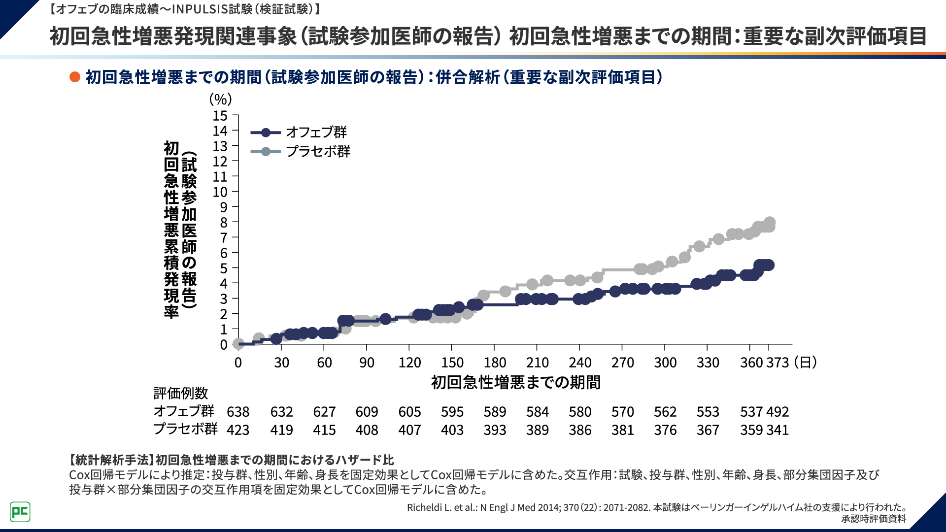 初回急性増悪発現関連事象(試験参加医師の報告) 初回急性増悪までの期間:重要な副次評価項目