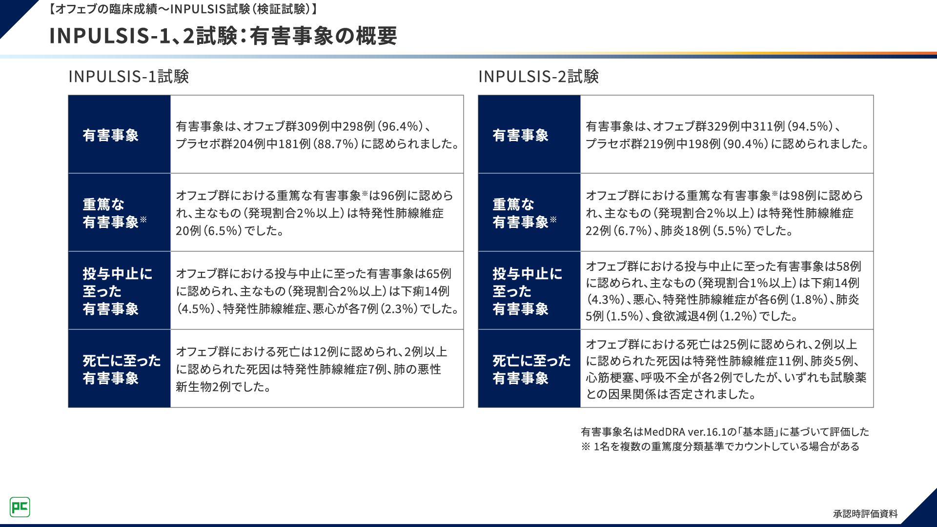 本試験を構成するINPULSIS-1試験及びINPULSIS-2試験の有害事象の概要を図10にお示しします。