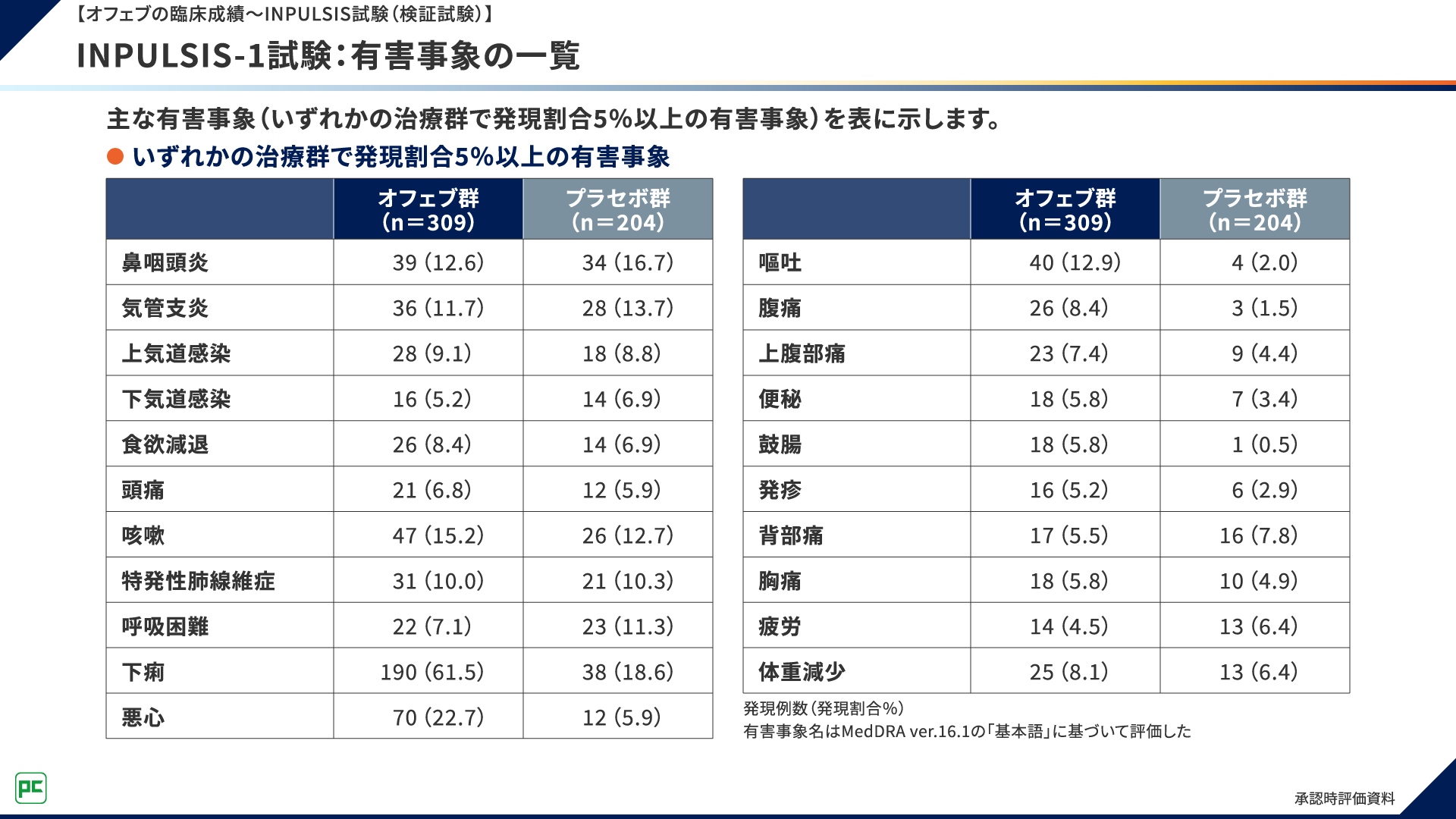 INPULSIS-1試験における主な有害事象は、オフェブ群で発現頻度が高い順に、下痢190例(61.5%)、悪心70例(22.7%)、咳嗽47例(15.2%)など、プラセボ群で下痢38例(18.6%)、鼻咽頭炎34例(16.7%)、気管支炎28例(13.7%)などでした(図11)。