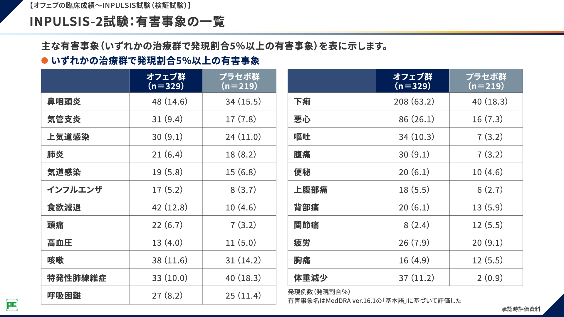 INPULSIS-2試験においては、有害事象は、オフェブ群329例中311例(94.5%)、プラセボ群219例中198例(90.4%)に認められました。