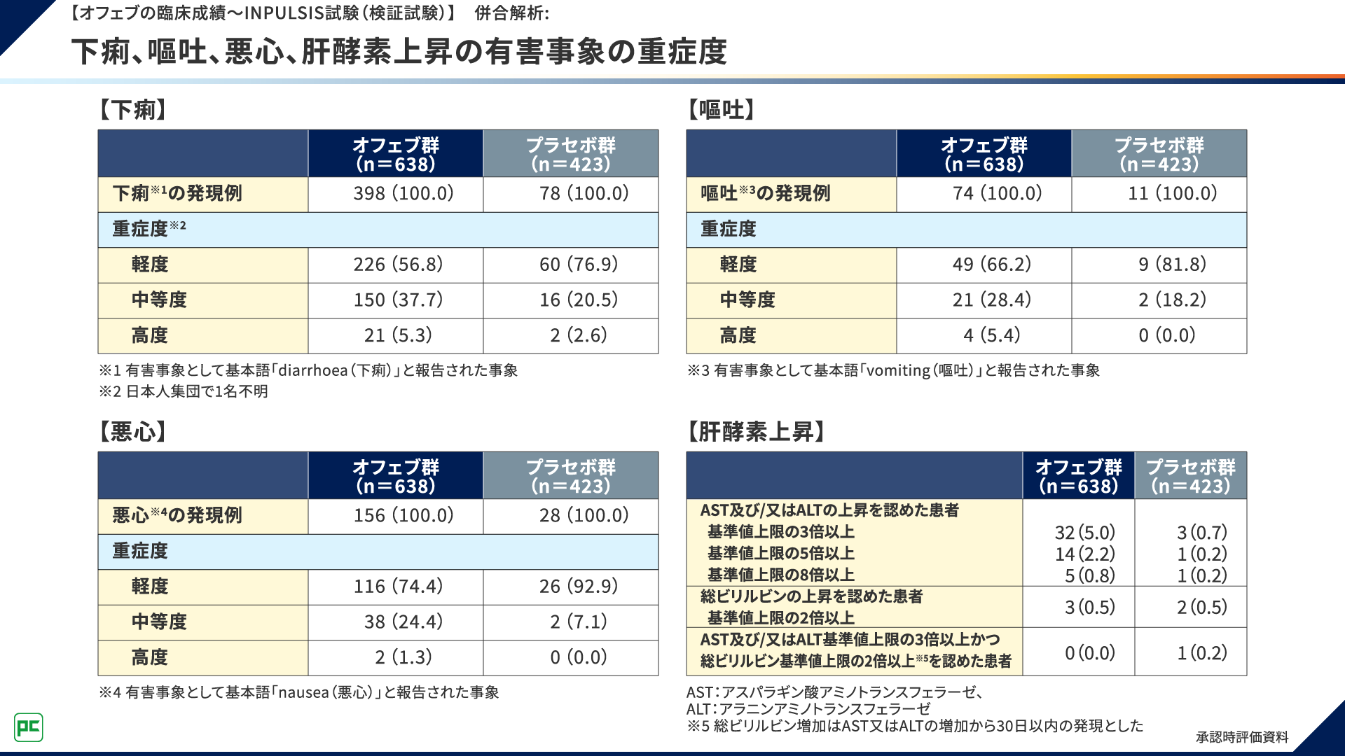 有害事象として認められた下痢、嘔吐、悪心、肝酵素上昇の重症度について、併合解析の結果は図13のとおりでした。