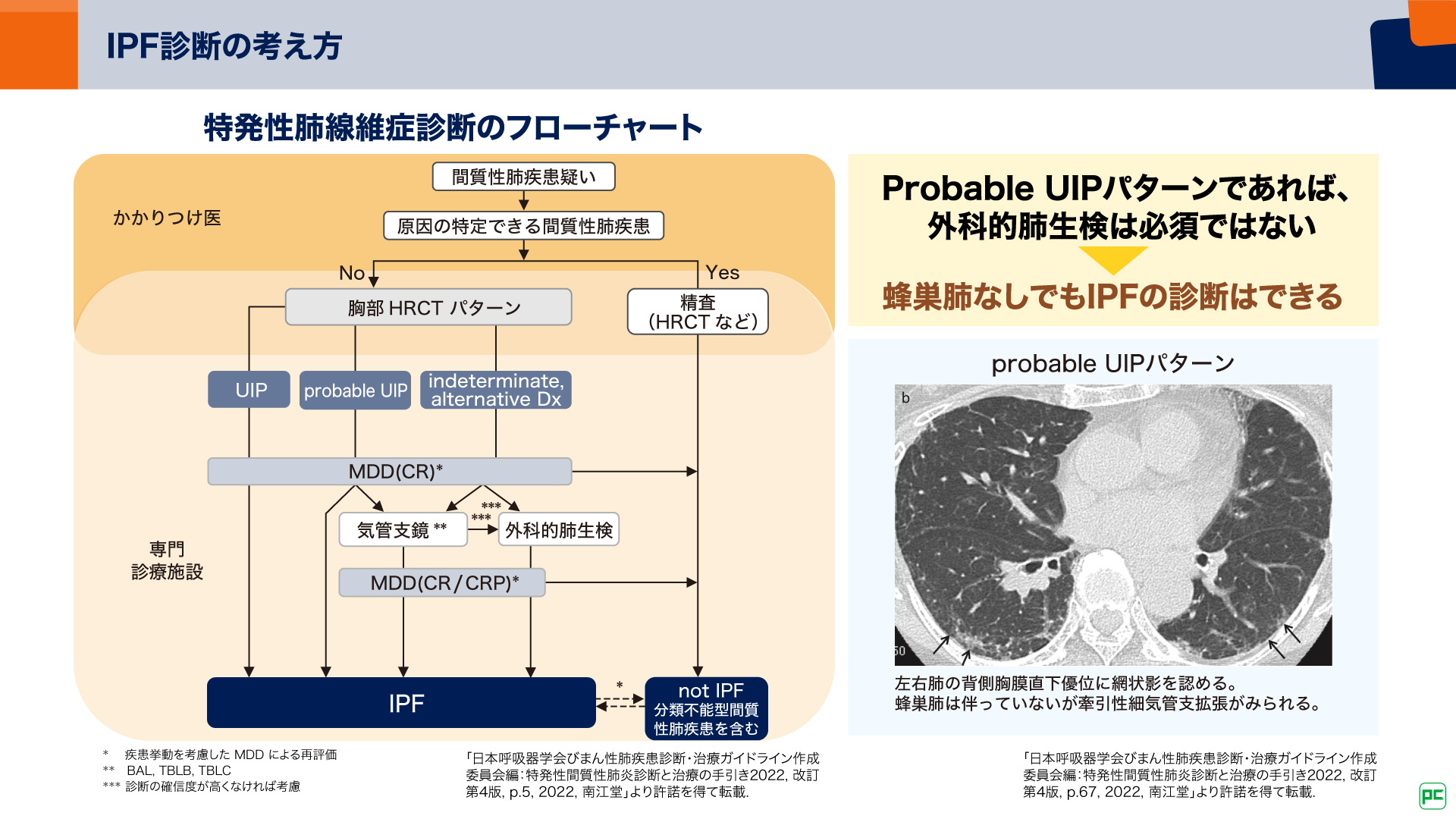 2022年の「ATS/ERS/JRS/ALAT IPF及び進行性肺線維症(PPF)国際診療ガイドライン」8)では、HRCTがProbable UIPパターンの場合は、多分野による集学的検討(MDD)を行った上で、IPFと診断できるとされました。わが国の「特発性間質性肺炎 診断と治療の手引き2022」9)でも同様に、Probable UIPパターンであれば外科的肺生検は必須ではありません(図12)。このような診断基準の変更の背景には、蜂巣肺を伴わない症例でも治療効果が示されたINPULSIS試験が根拠のひとつになったと考えられます。こうした流れは、IPFの早期診断・早期治療の重要性をより強調することとなり、実臨床にも大きな変化をもたらしました。