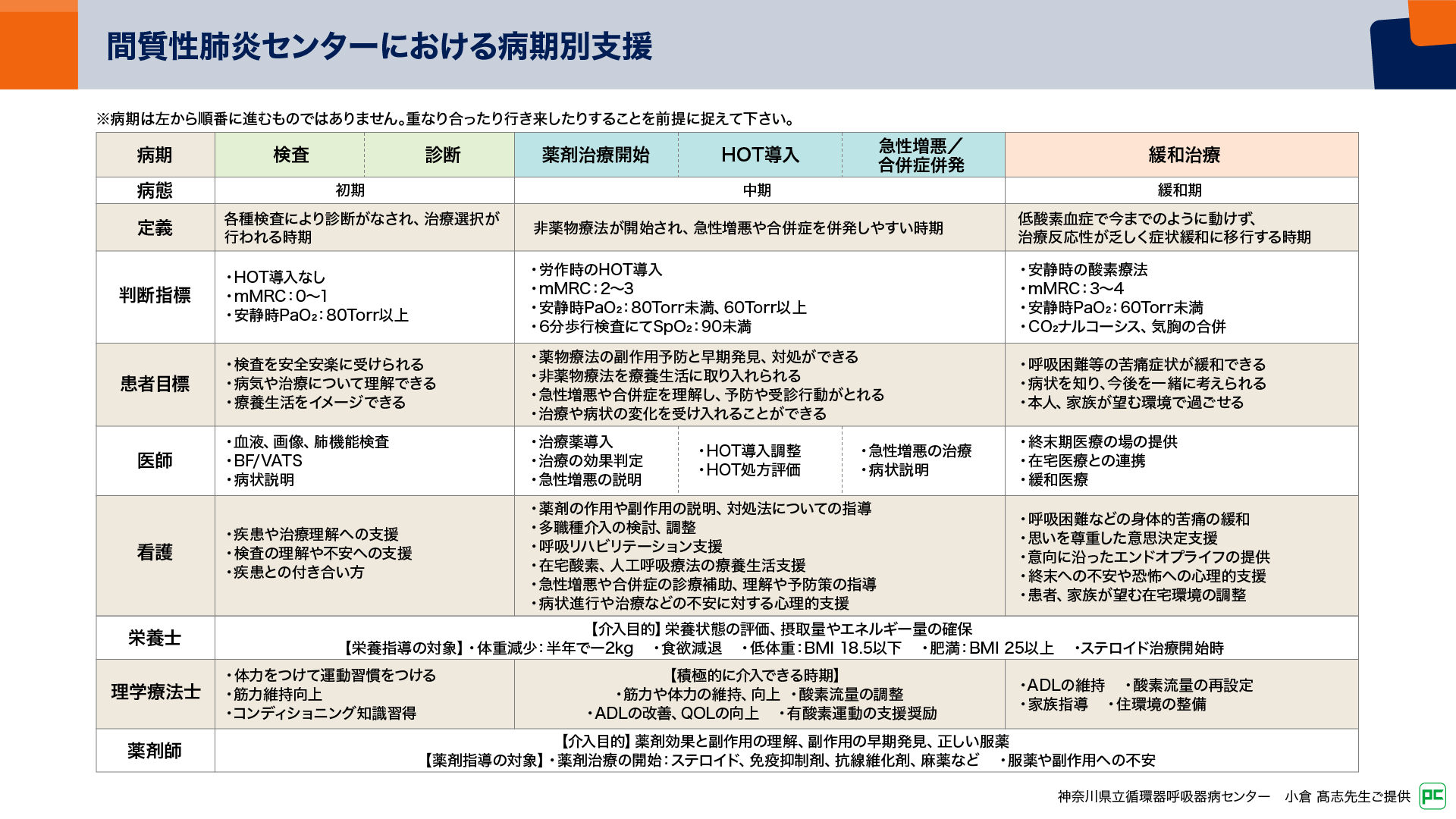 次に包括的なケアです。当センターでは「病期別支援シート」(図13)に基づき、看護師、薬剤師、理学療法士、栄養士など多職種が連携し、患者さんの状態に応じた介入を行っています。全身状態が不良な患者さんでは、栄養指導を加えた包括呼吸リハビリテーションを開始して全身状態を改善させ、その後に抗線維化薬治療につなげることもあります。こうした包括的なアプローチが、治療継続率を高める上で大きな力になっています。