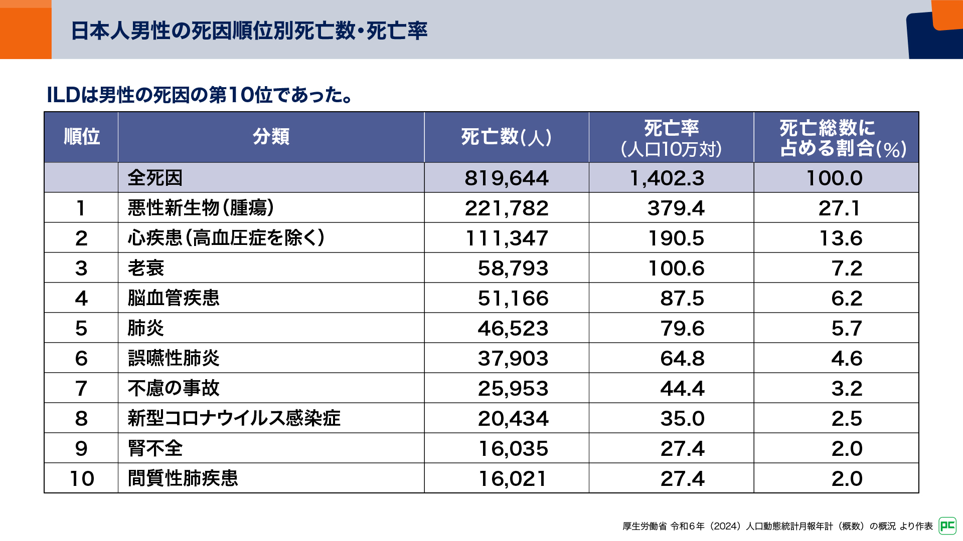 2024年度の厚生労働省人口動態統計の概数では、IPFを含むILDは死因第10位であると報告されています(図15)11)。しかし、IPFの認知度は未だ低く、地域連携や早期診断、治療介入が十分に進んでいるとはいえません。また、抗線維化薬の副作用マネジメントが進歩し、治療開始のハードルが下がってきています。今後は肺移植の年齢制限をふまえて、家族性や若年発症の患者さんなど、高リスク例を早期に同定し、適切な治療介入を検討することも課題のひとつです。加えて、適切な検査間隔や咳などの自覚症状の管理方法が十分に確立していないことにも注目していくべきだと思います。