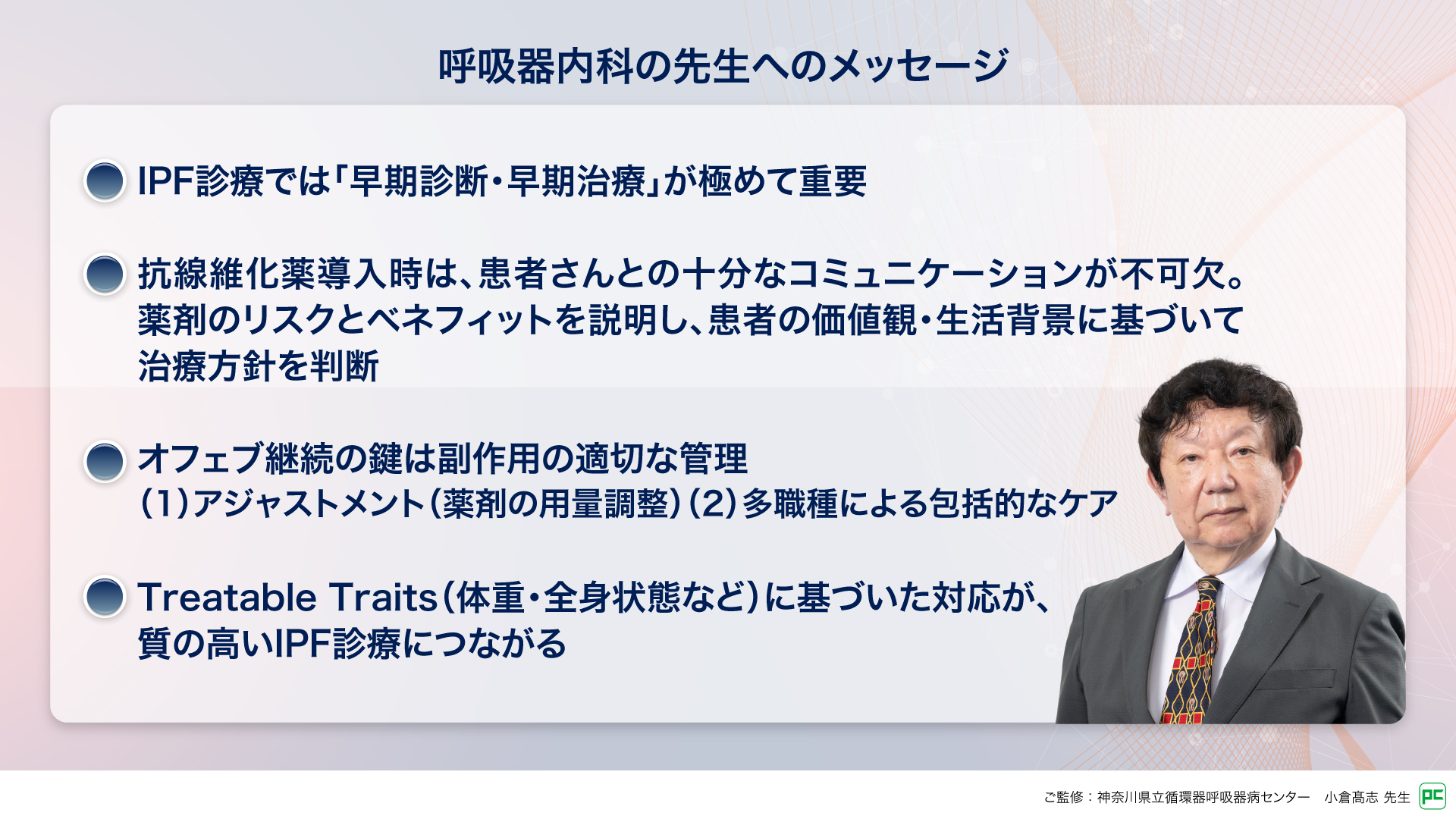 オフェブの登場は新たな治療選択肢を提供し、この領域に若手医師の関心を引きつける要因のひとつになったと感じています。ますますこの流れが高まることを期待しています。今回ご紹介した内容が、先生方の診療の質向上につながり、IPF患者さんへのよりよいケアの実現に貢献できれば幸いです。