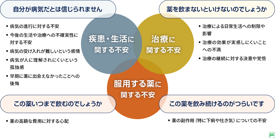 オフェブを服用される患者さんは、疾患や生活、治療、服用する薬に対し、さまざまな悩みや不安を抱えていると考えられます。
