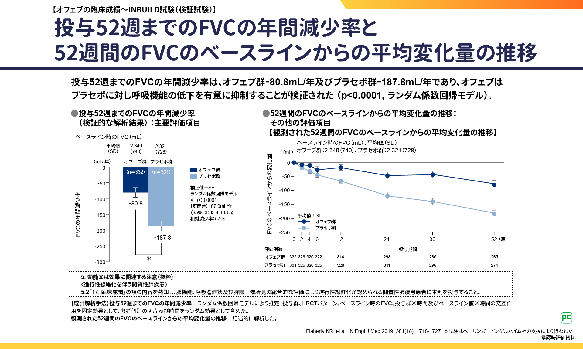 本試験の結果、投与52週までのFVCの年間減少率は、オフェブ群-80.8mL/年及びプラセボ群-187.8mL/年であり、オフェブはプラセボに対し呼吸機能の低下を有意に抑制することが検証されました(図7左)。