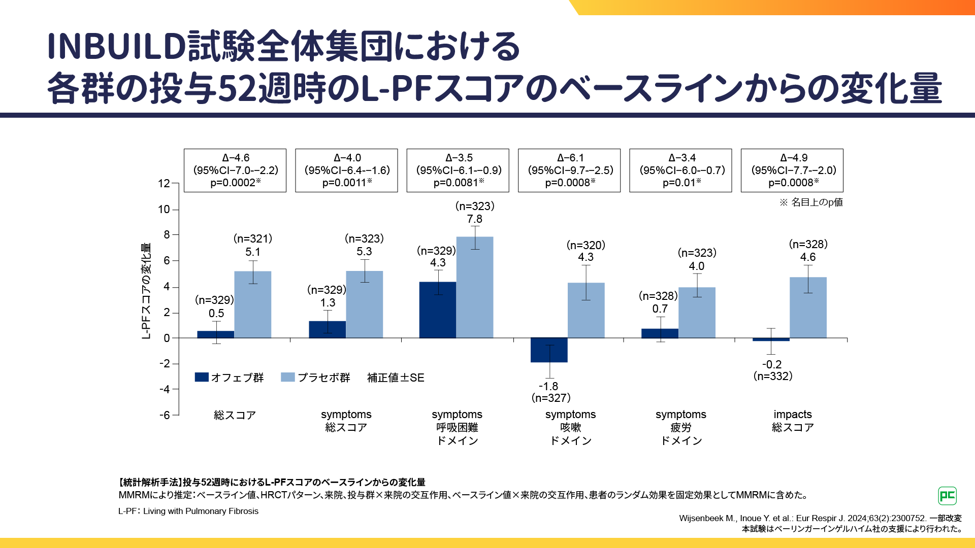 本試験では、オフェブの呼吸器症状に対する影響について、L-PFスコアを用いて検討されました。L-PFスコアは、肺線維症患者さんにおける症状に関する評価指標であり、symptomsとimpactsという2つのモジュールからなる44項目の質問で構成されます。なお、symptomsモジュールは、呼吸困難、咳嗽、疲労の3つのドメインで構成されています。symptoms及びimpactsスコアからL-PF総スコアが計算されます。
