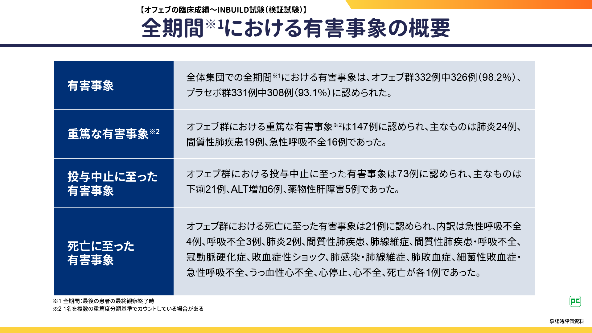本試験の全期間における有害事象は、オフェブ群で326例(98.2%)、プラセボ群で308例(93.1%)に認められました。重篤な有害事象、投与中止に至った有害事象、死亡に至った有害事象は、図10のとおりでした。