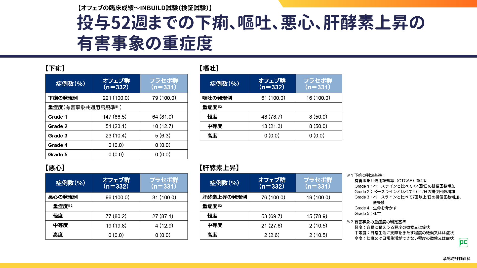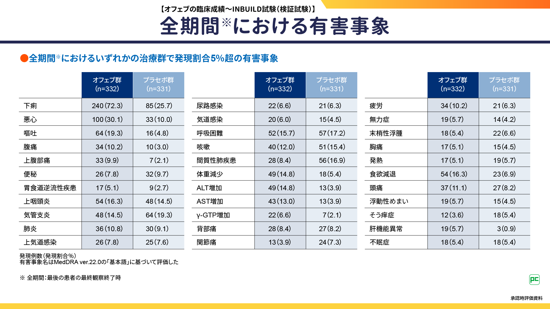主な有害事象は、発現頻度が高い順にオフェブ群で下痢240例(72.3%)、悪心100例(30.1%)、嘔吐64例(19.3%)など、プラセボ群で下痢85例(25.7%)、気管支炎64例(19.3%)、呼吸困難57例(17.2%)などでした(図11)。