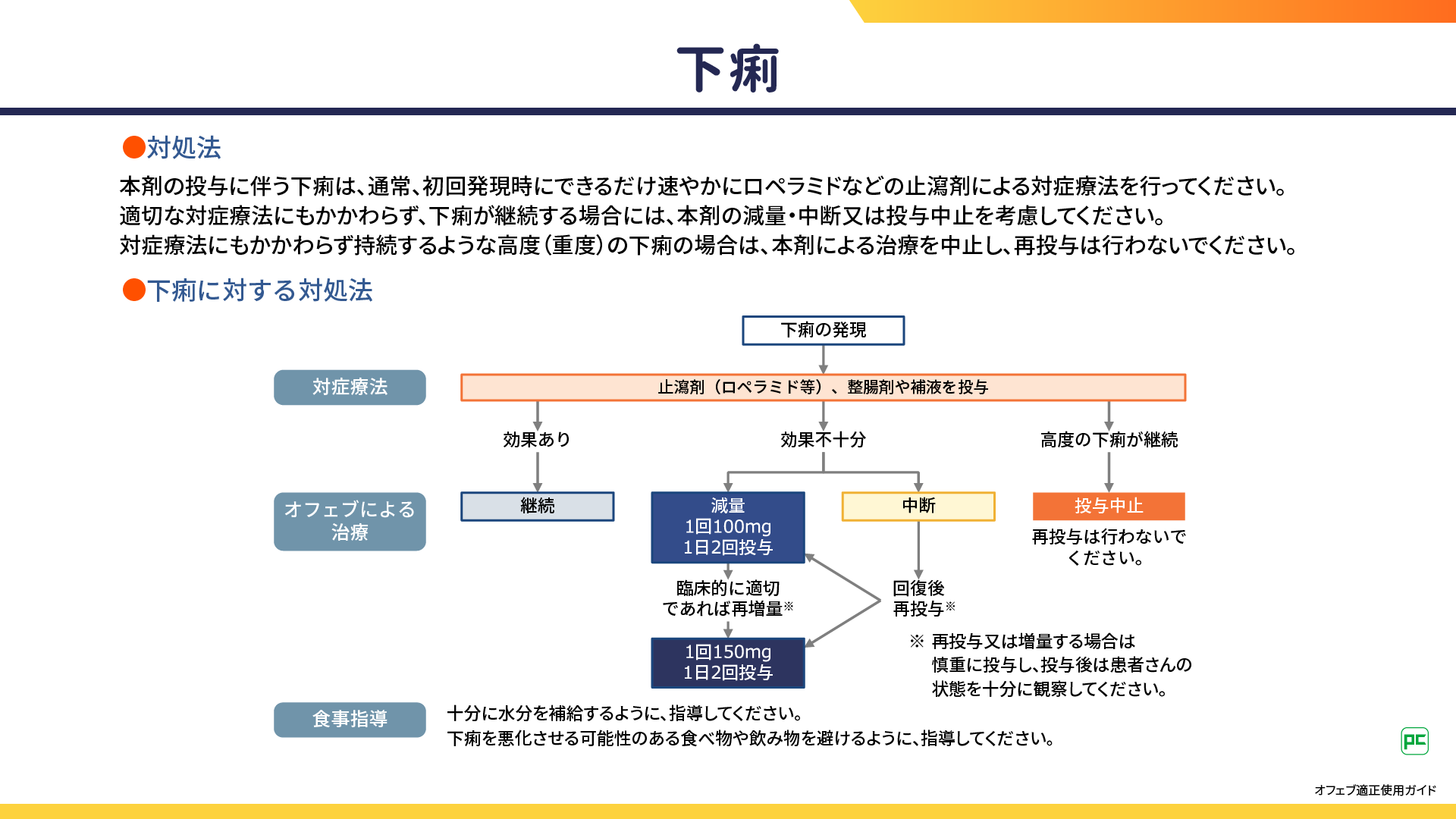 オフェブの投与に伴う下痢は、通常、初回発現時にできるだけ速やかにロペラミドなどの止瀉剤による対症療法を行います。