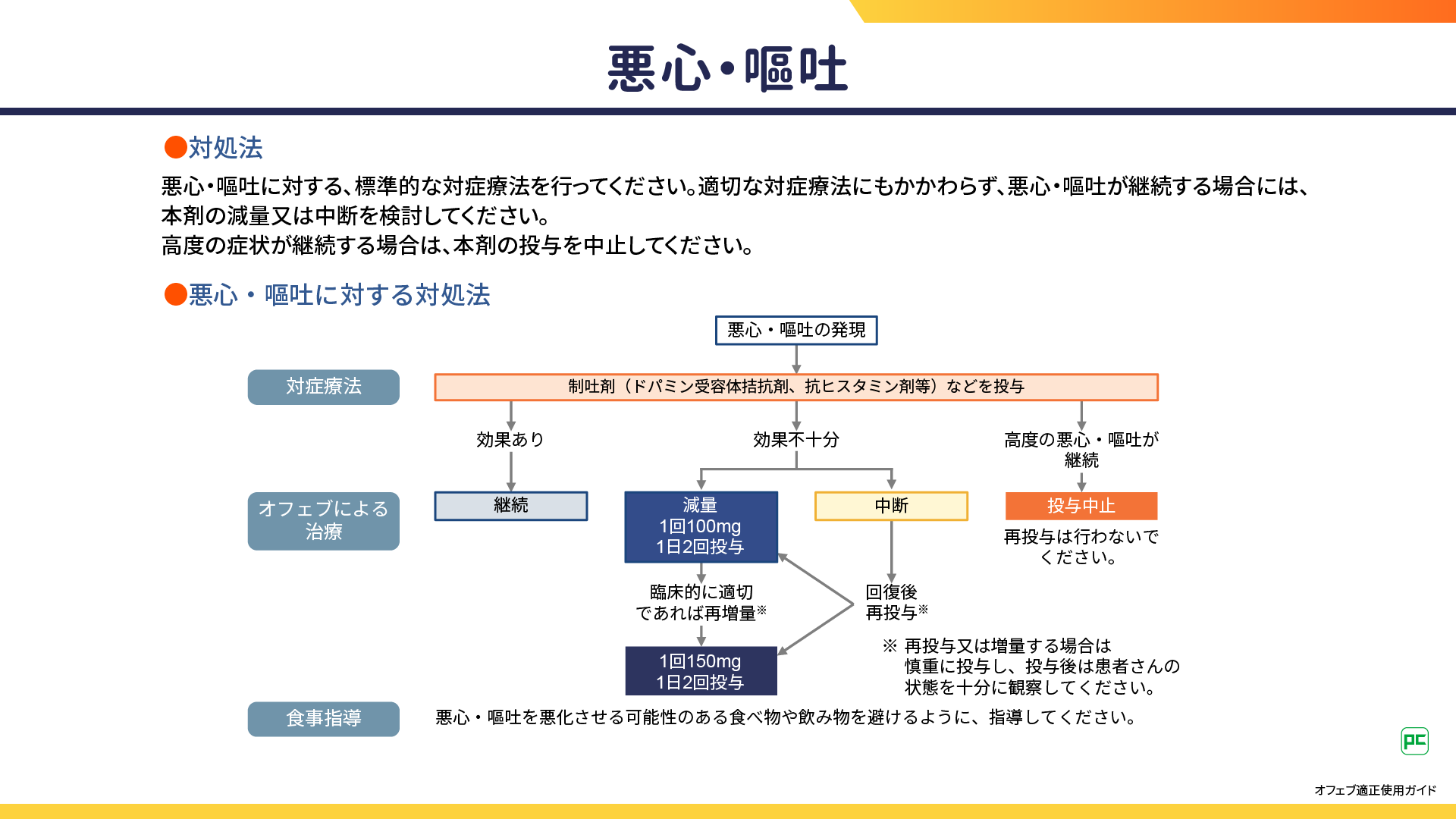 悪心・嘔吐に対しては、標準的な対症療法を行います。適切な対症療法にもかかわらず、悪心・嘔吐が継続する場合には、本剤の減量又は中断を検討します。高度の症状が継続する場合は、本剤の投与を中止します。