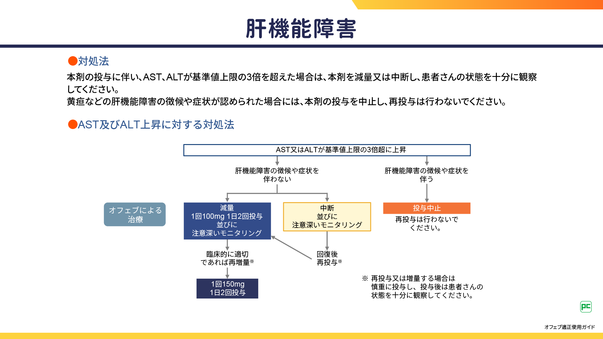 本剤の投与に伴い、AST、ALTが基準値上限の3倍を超えた場合は、本剤を減量又は中断し、患者さんの状態を十分に観察します。黄疸などの肝機能障害の徴候や症状が認められた場合には、本剤の投与を中止し、再投与は行わないようにします。