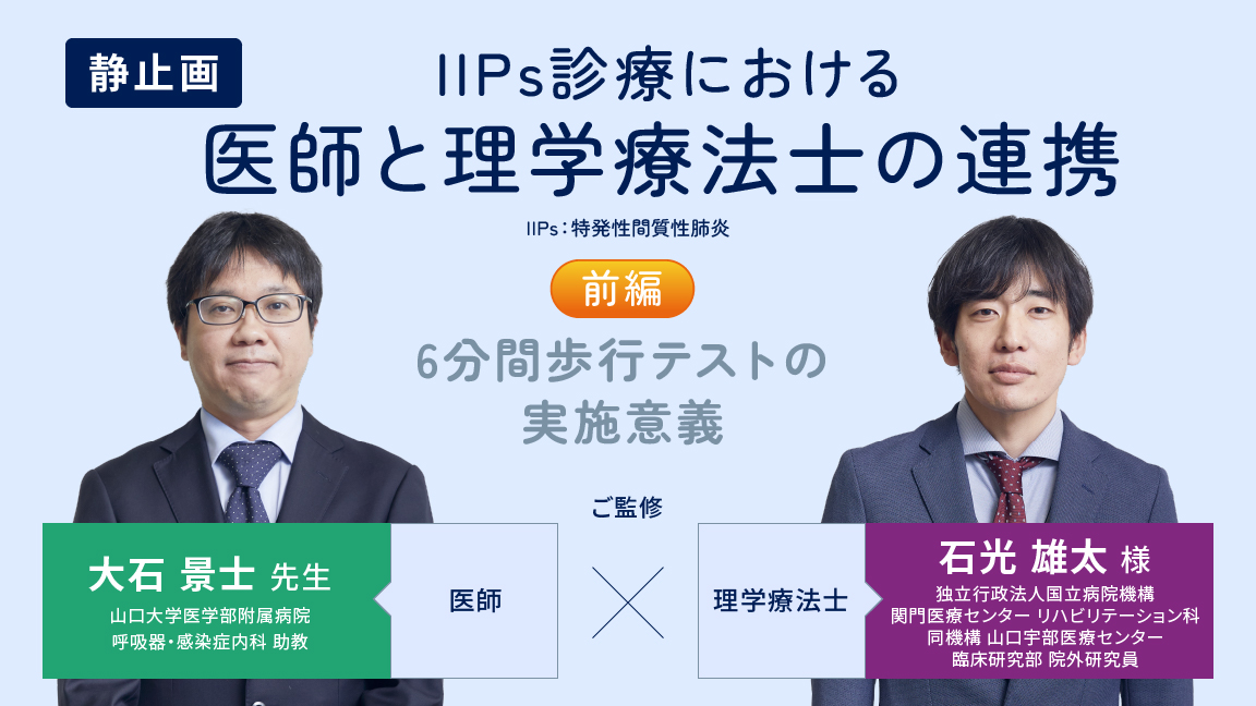 本シリーズでは、前編・後編の2回にわたって、IIPs診療における医師と理学療法士の連携について、山口大学医学部附属病院 呼吸器・感染症内科 助教 大石 景士先生と、独立行政法人国立病院機構 関門医療センター リハビリテーション科、同機構 山口宇部医療センター 臨床研究部 院外研究員 石光 雄太様にうかがいます。前編は、重症度評価を中心とした6分間歩行テストの実施意義についてです。