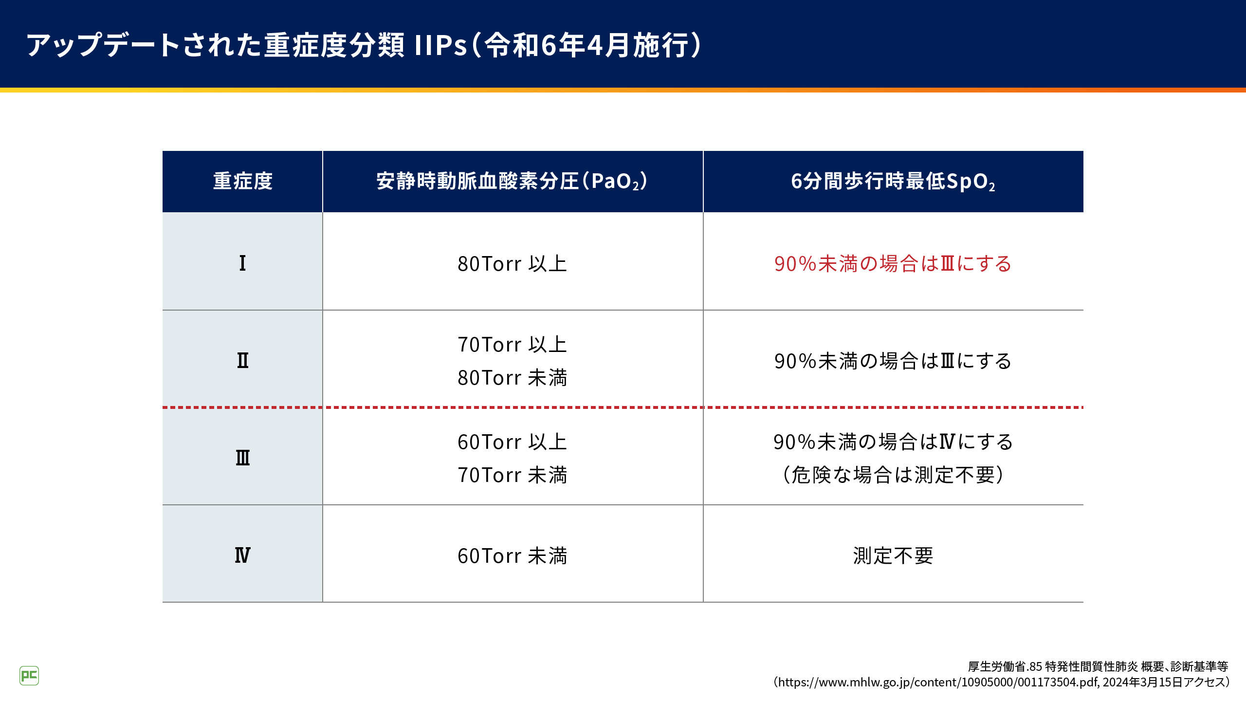 改定されたIIPsの重症度分類では、安静時動脈血酸素分圧(PaO2)が80Torr以上であっても、6分間歩行テストで最低SpO2が90%未満になると、難病医療費助成の対象となる重症度Ⅲ度になります(図2)。改定前はPaO2が80Torr以上の場合は、デサチュレーションの有無にかかわらず重症度Ⅰ度の分類であり、難病医療費助成を受けるには、高額な医療を継続することが必要※1な場合として軽症高額の認定を受ける必要がありました。患者さんにとっては、重症度Ⅲ度に認定されるか重症度Ⅰ度に認定されるかで、経済的な負担が大きく変わってくるため、重要な改定のポイントだと思います。