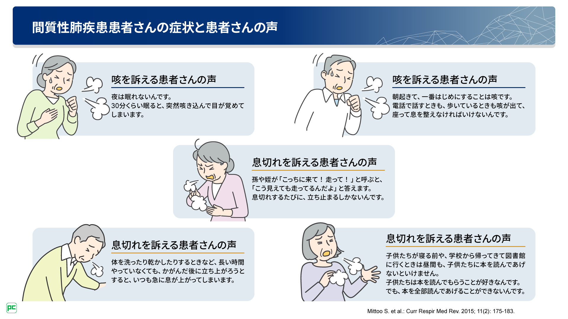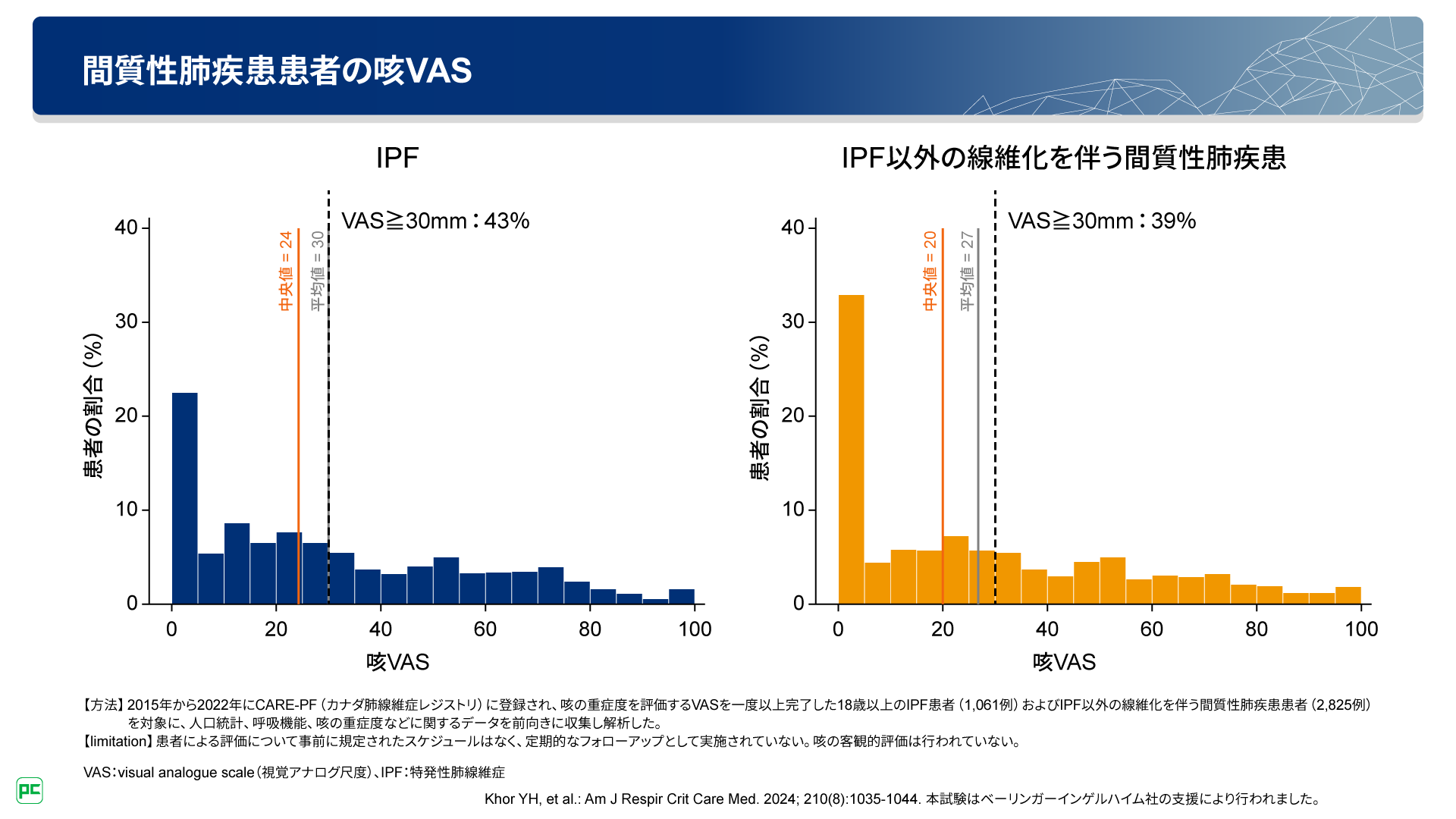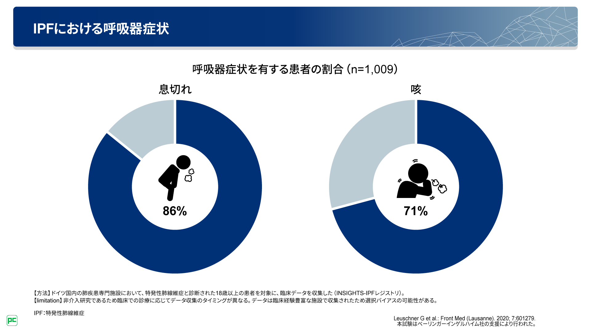 - 咳などの呼吸器症状は、IPFを含む間質性肺疾患患者さんにおいて重要な課題である。
