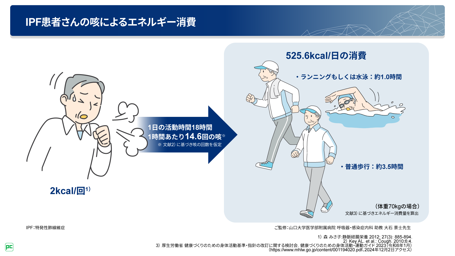 また、咳は1回あたり2kcalを消費するといわれ1)、頻繁な咳は体重減少の要因となる可能性があります。患者さんの1日の活動時間を18時間、1時間あたり14.6回咳をする※1と仮定した場合、咳による消費エネルギーは1日あたり525.6kcalとなります。これは、体重70kgの方がランニングや水泳であれば約1.0時間、普通歩行であれば約3.5時間で消費するエネルギーとほぼ同じです(図3)※2。