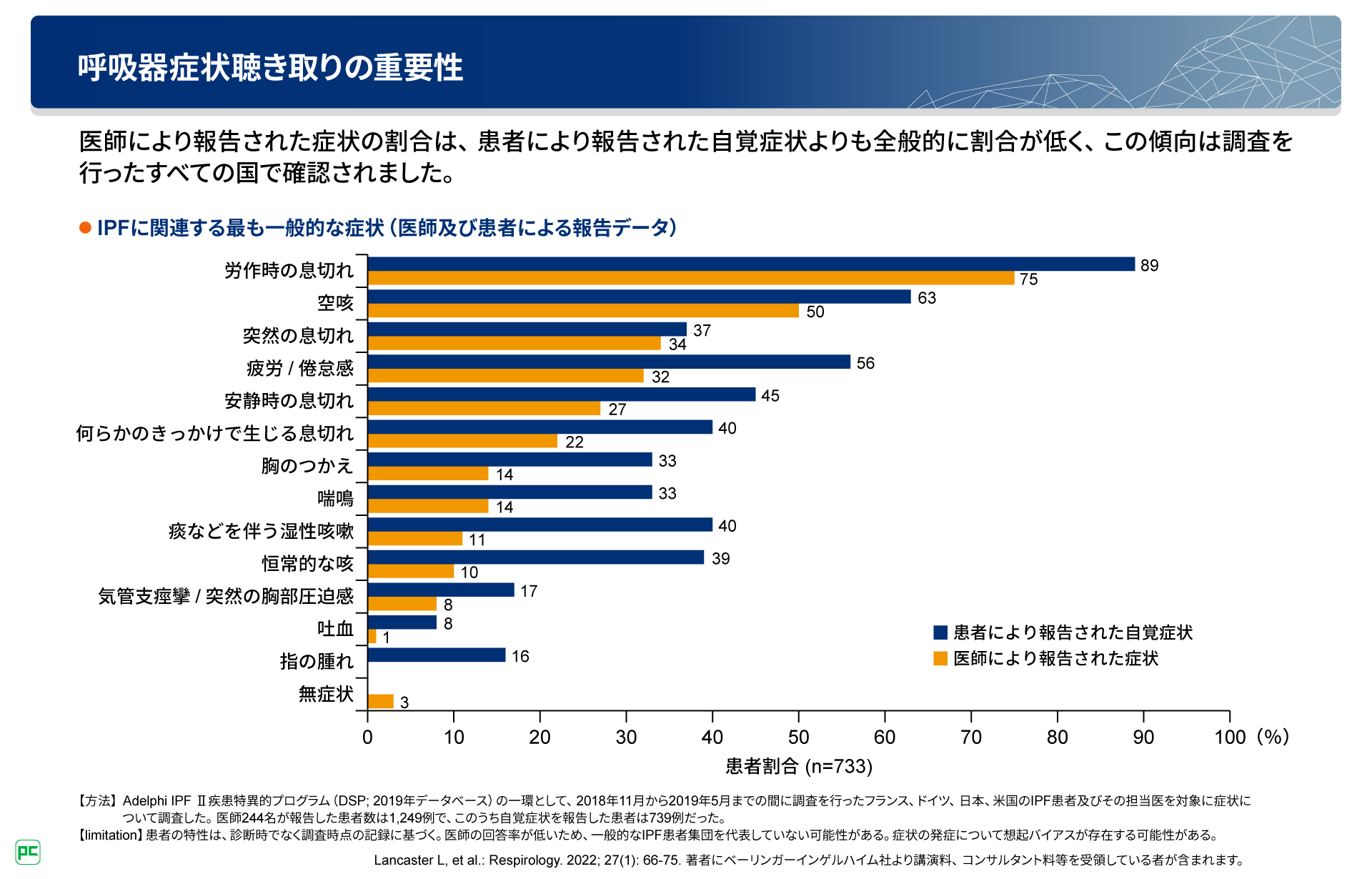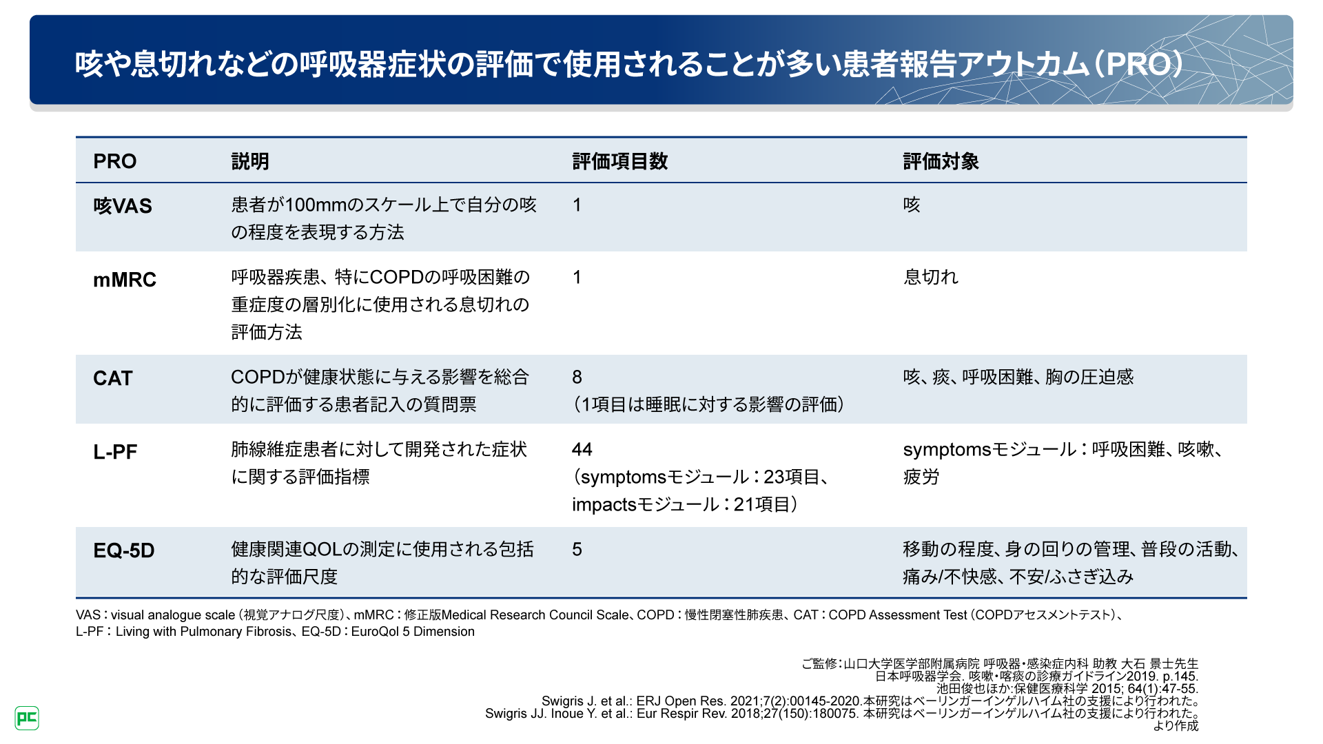 - 呼吸器症状を含む症状に対する認識には医師-患者間ギャップがあることから、患者報告アウトカム(PRO)を用いて症状を定期的に評価し、治療が必要な患者さんを見落とさないよう注意することも重要である。