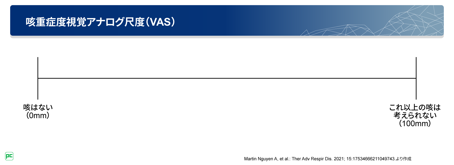 - 咳の評価に用いる患者報告アウトカムとして、咳VASは臨床上有用である。