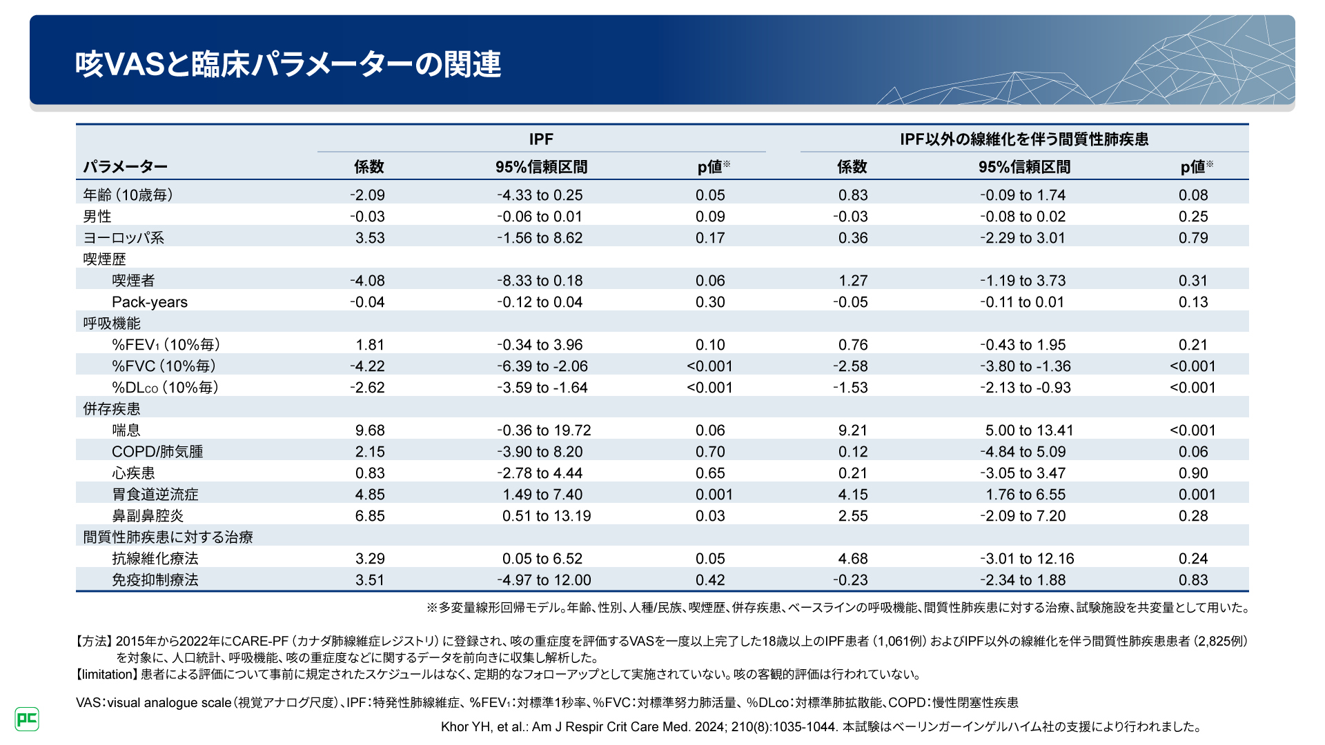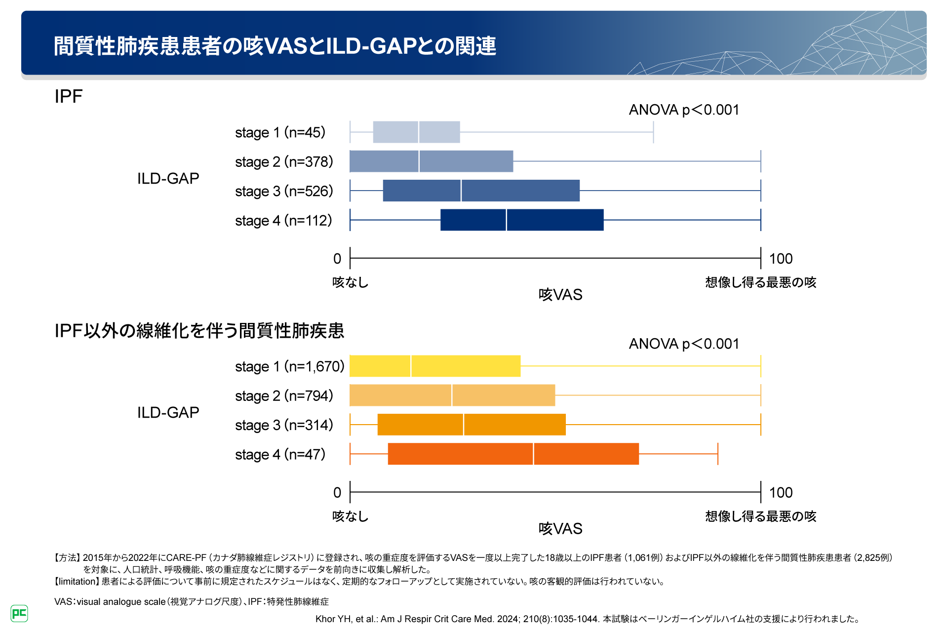 この結果から、咳VASは臨床で簡便に実施することが可能でありながら、間質性肺疾患の重症度尺度とも相関した有用な評価方法であるといえます。
