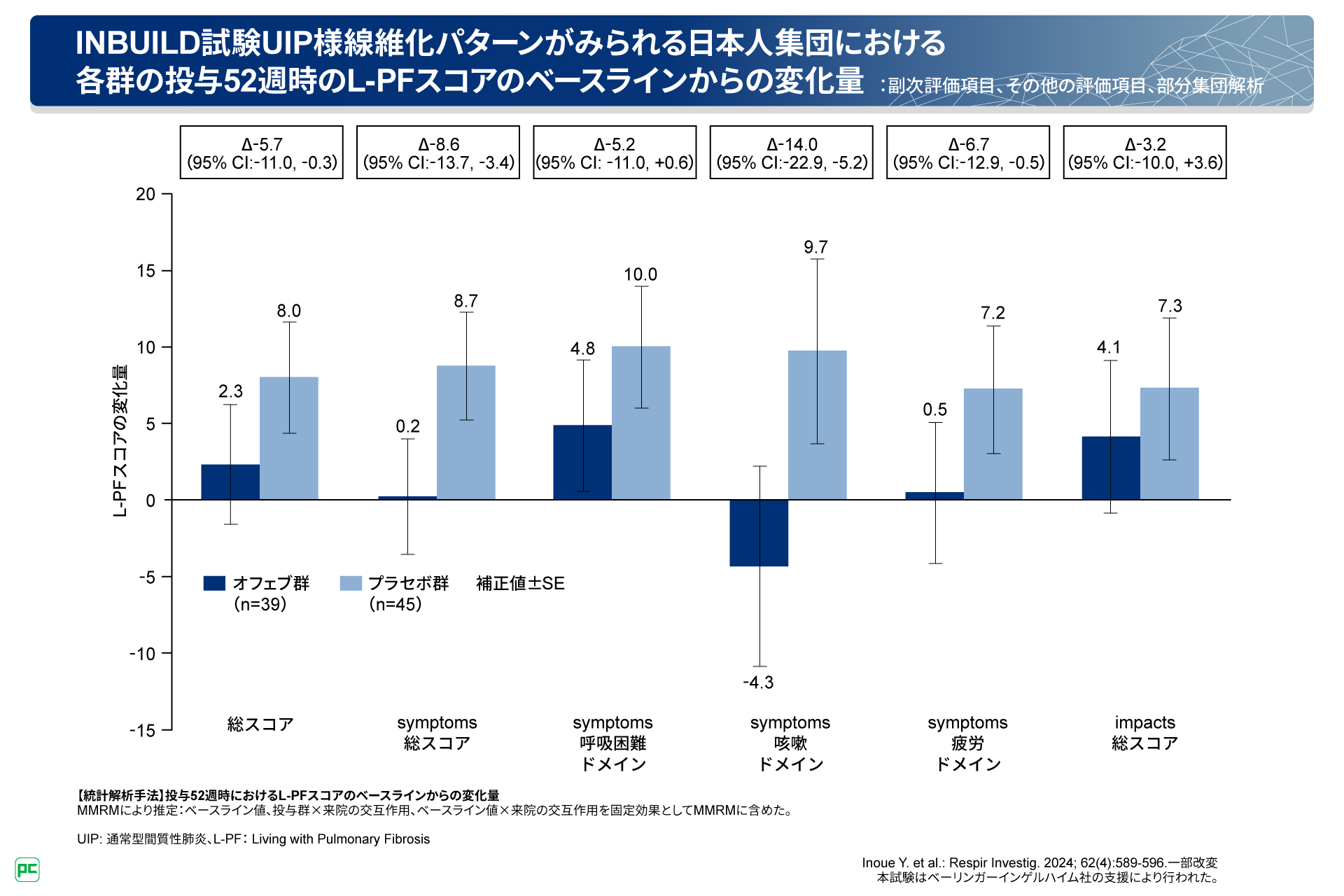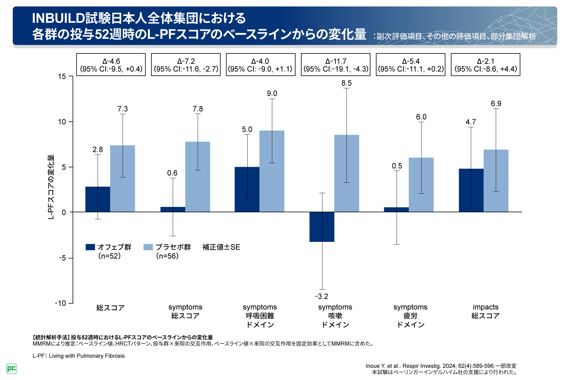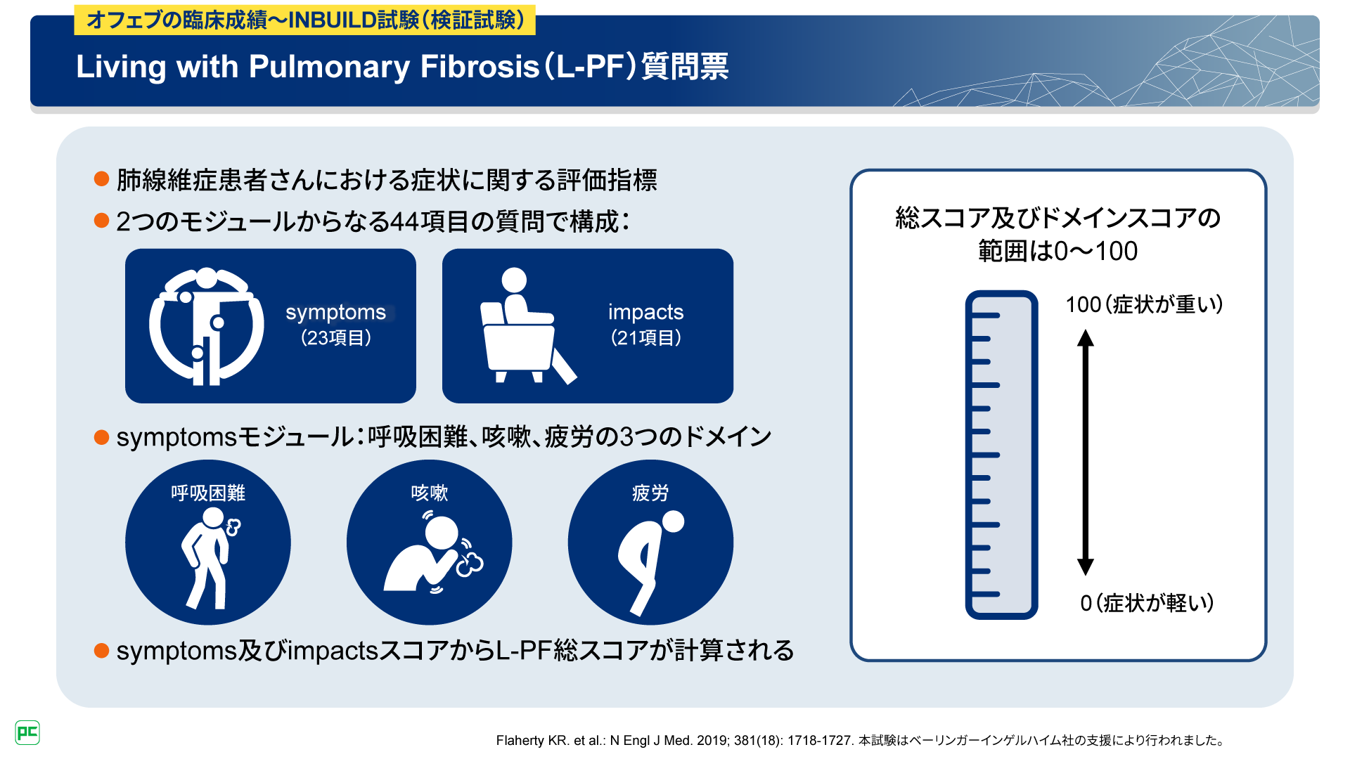 - オフェブはINBUILD試験において、FVCのベースラインからの変化量に加えて、symptoms 咳嗽ドメインを含むL-PFスコアへの影響が検討されている。