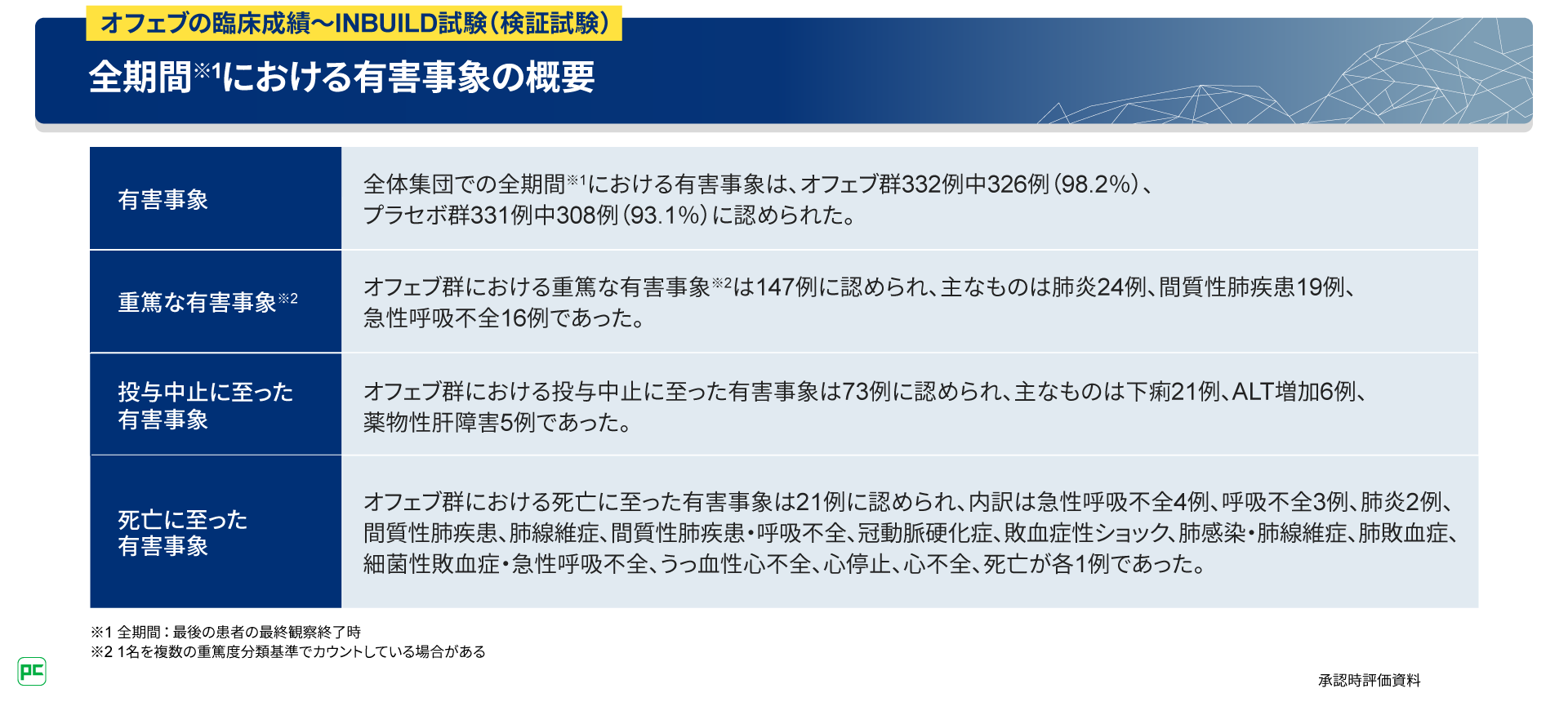 本試験の全期間における有害事象は、オフェブ群で326例(98.2%)、プラセボ群で308例(93.1%)に認められました。オフェブ群における重篤な有害事象として主なものは肺炎24例、間質性肺疾患19例、急性呼吸不全16例などでした。オフェブ群において投与中止に至った有害事象は下痢21例、ALT増加6例、薬物性肝障害5例などであり、死亡に至った有害事象は、急性呼吸不全4例、呼吸不全3例などでした(図17)。