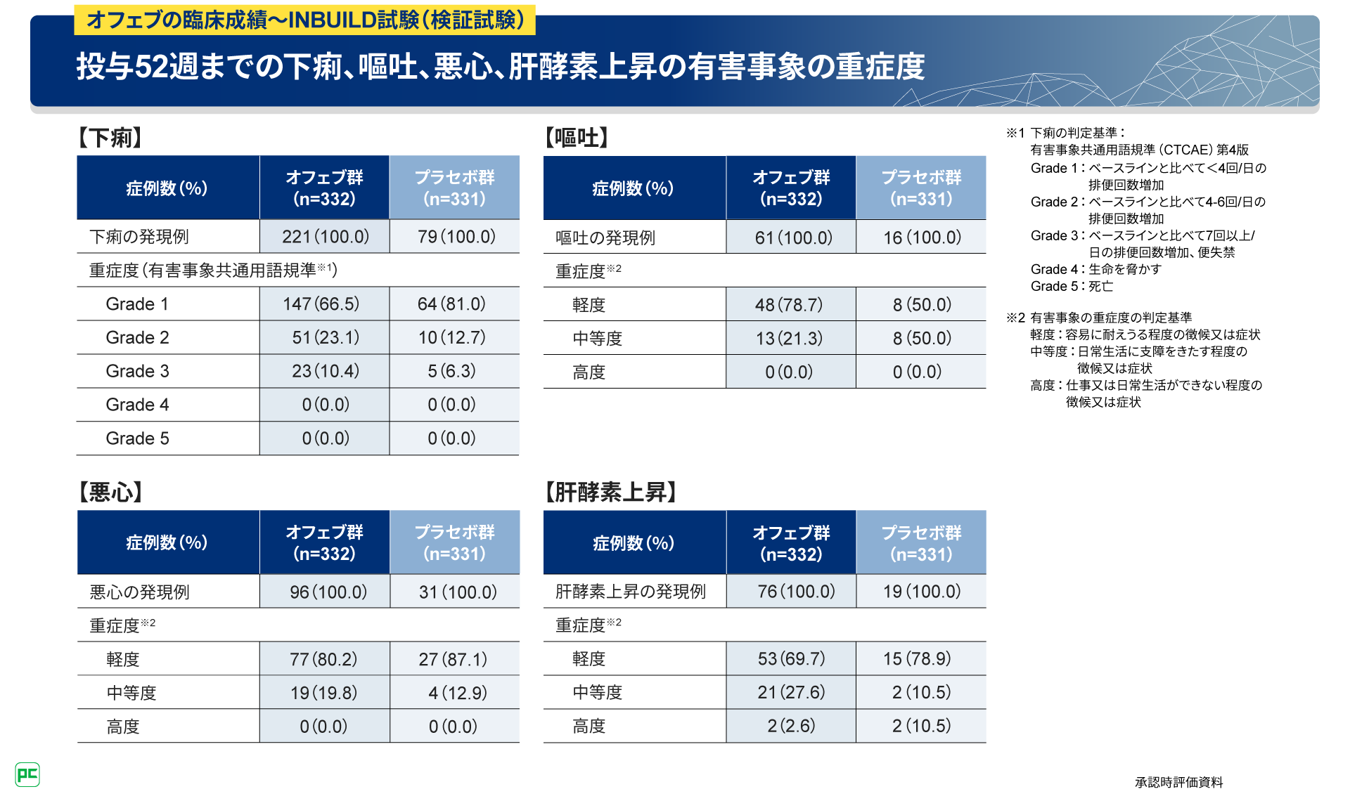 続いて、投与52週までの下痢、嘔吐、悪心、肝酵素上昇の有害事象の重症度をお示しします。オフェブ群において、下痢は、有害事象共通用語規準を用いた評価ではGrade 1が66.5%、Grade 2が23.1%、Grade 3が10.4%でした。嘔吐と悪心、肝酵素上昇は有害事象の重症度の判定基準を用いて評価しています。嘔吐は軽度が78.7%、中等度が21.3%、悪心は軽度が80.2%、中等度が19.8%、でした。肝酵素上昇は軽度が69.7%、中等度が27.6%、高度が2.6%でした(図19)。