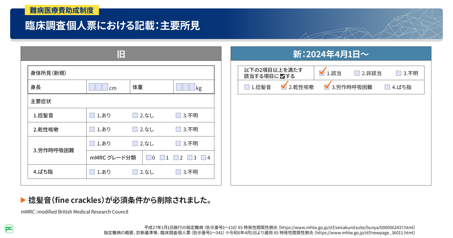 従来の基準では指定難病の医療費助成対象外であったために、抗線維化薬などの高額な治療の開始を躊躇されていた患者さんもいらっしゃったかと思います。アップデートされた診断基準及び重症度分類に基づいて、新様式の臨床調査個人票で申請いただくことで、患者さんに必要な治療の検討をスムーズに進められるようになることを願っています。