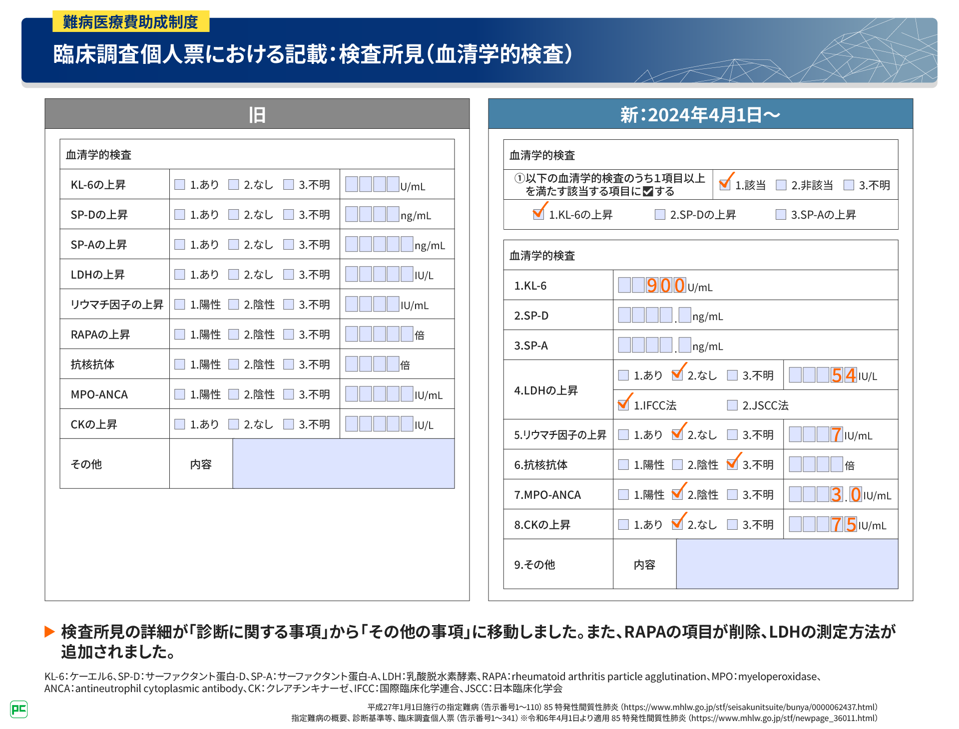 臨床調査個人票においては、呼吸機能検査の結果に「該当」「非該当」「不明」選択式が追加されました。FVCの記載欄は「その他の事項」へ、「6分間歩行時SpO2試験の実施」は「重症度分類に関する事項」へ移動しています。