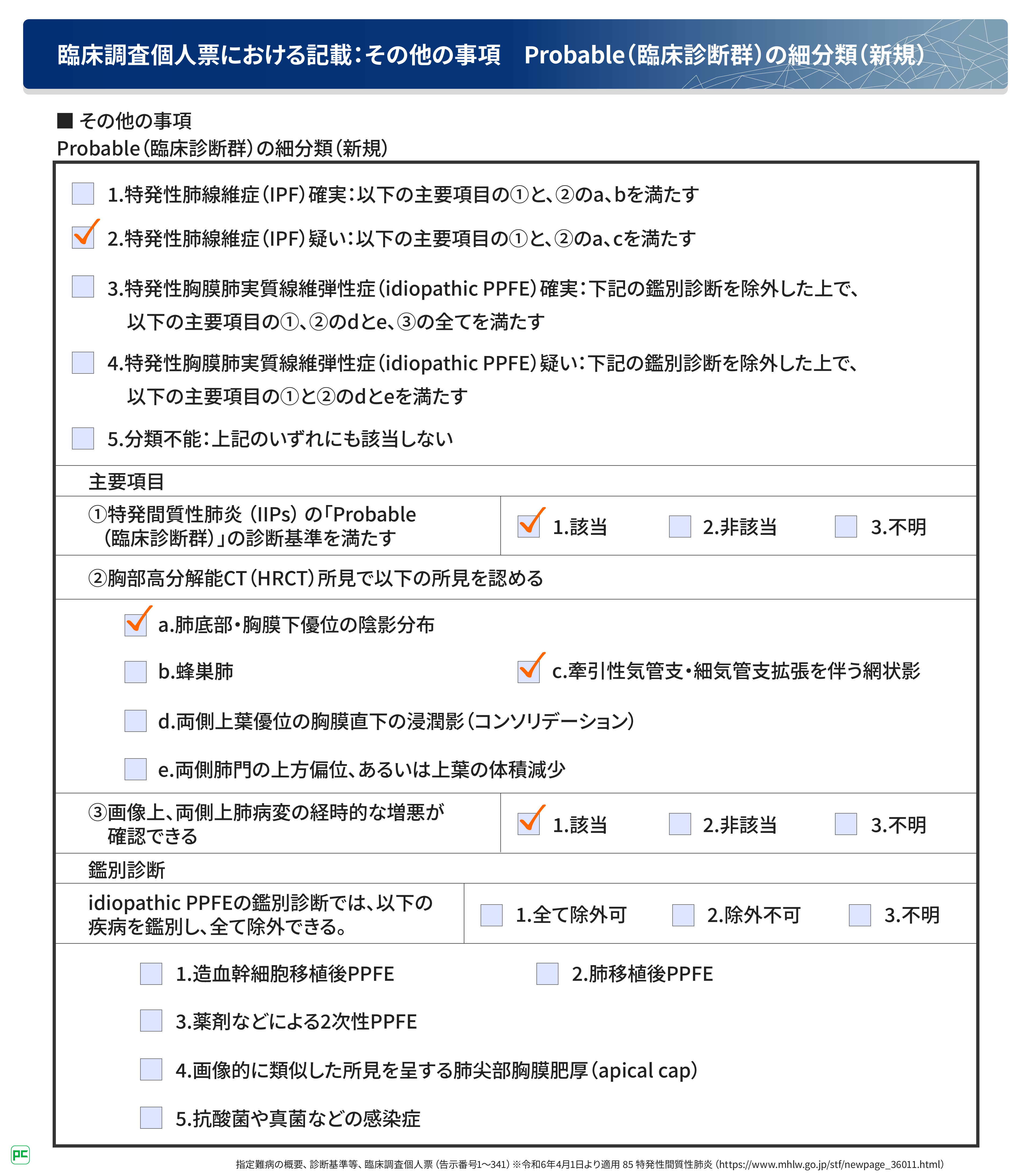 臨床調査個人票においては、「その他の事項」に「Probable(臨床診断群)の細分類」として記載欄が設けられています。