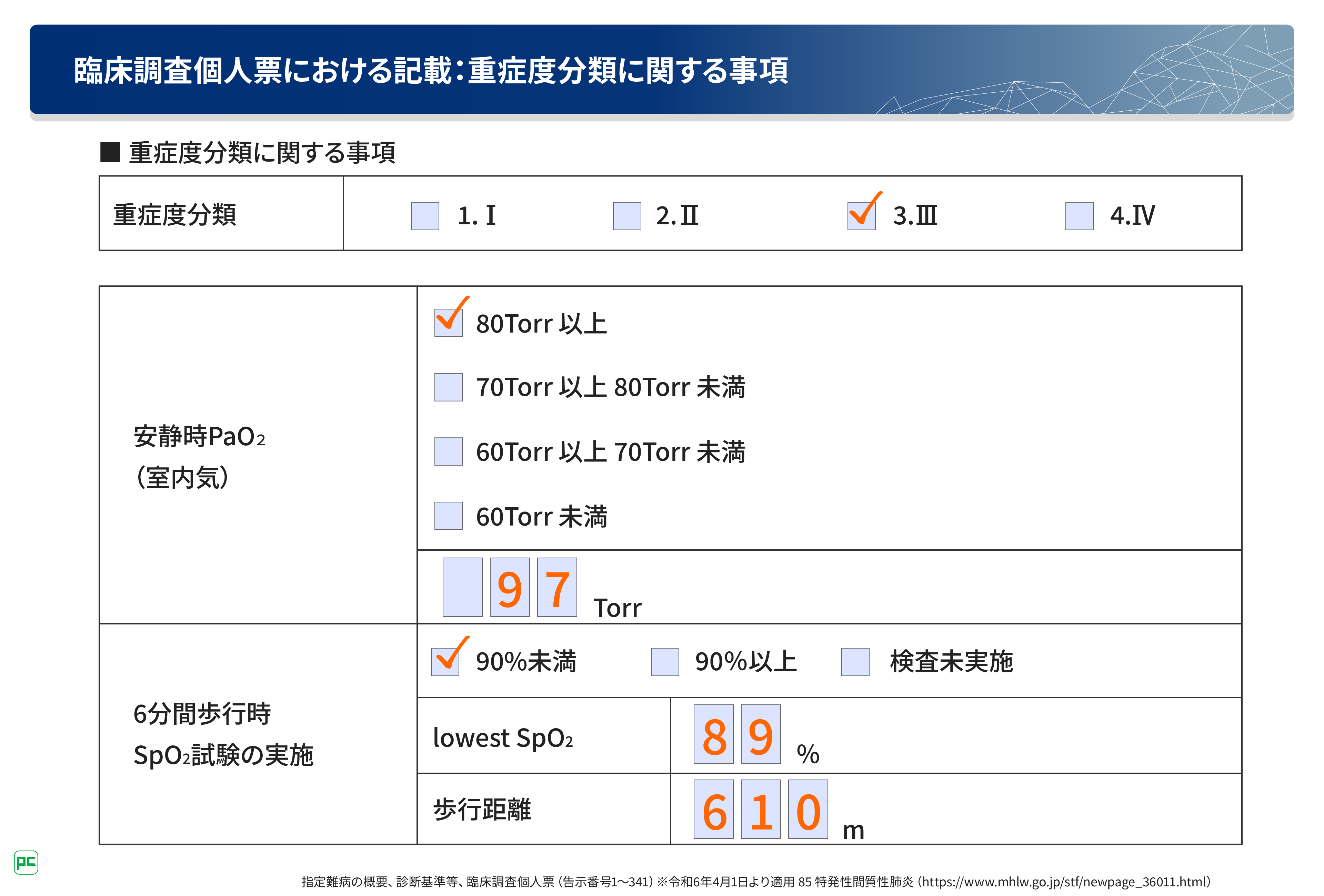 今回の症例は、安静時PaO2 80Torr以上のため、従来の基準では重症度Ⅰ度となりますが、6分間歩行時最低SpO2 90%未満のため、新たな基準ではⅢ度となり、医療費助成の申請が可能になります。