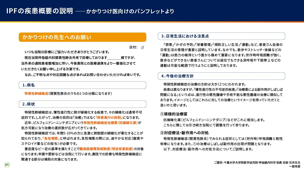 認知度は上がってきたものの、ILDはまだまだなじみがない疾患だと思っています。特に、ILDの中でも予後の悪いと言われる特発性肺線維症(IPF)についてはかかりつけ医の先生に知っていただくためのパンフレットを作成し、紹介状と一緒にお渡しするようにしています。